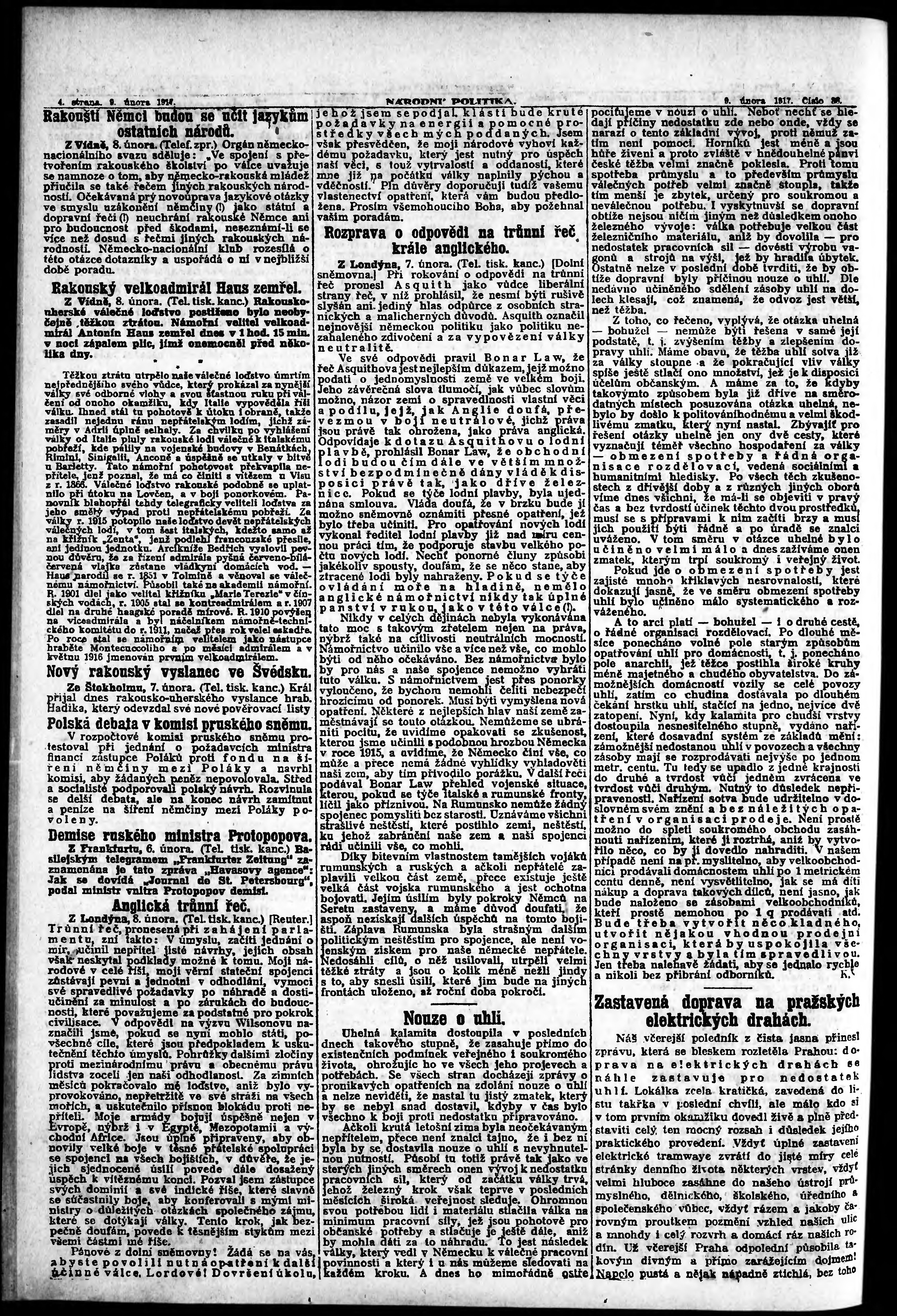 * Datum vydání výtisku: 9.2.1917 Číslo výtisku: 38 Poznámky k výtisku: ranní vydání;