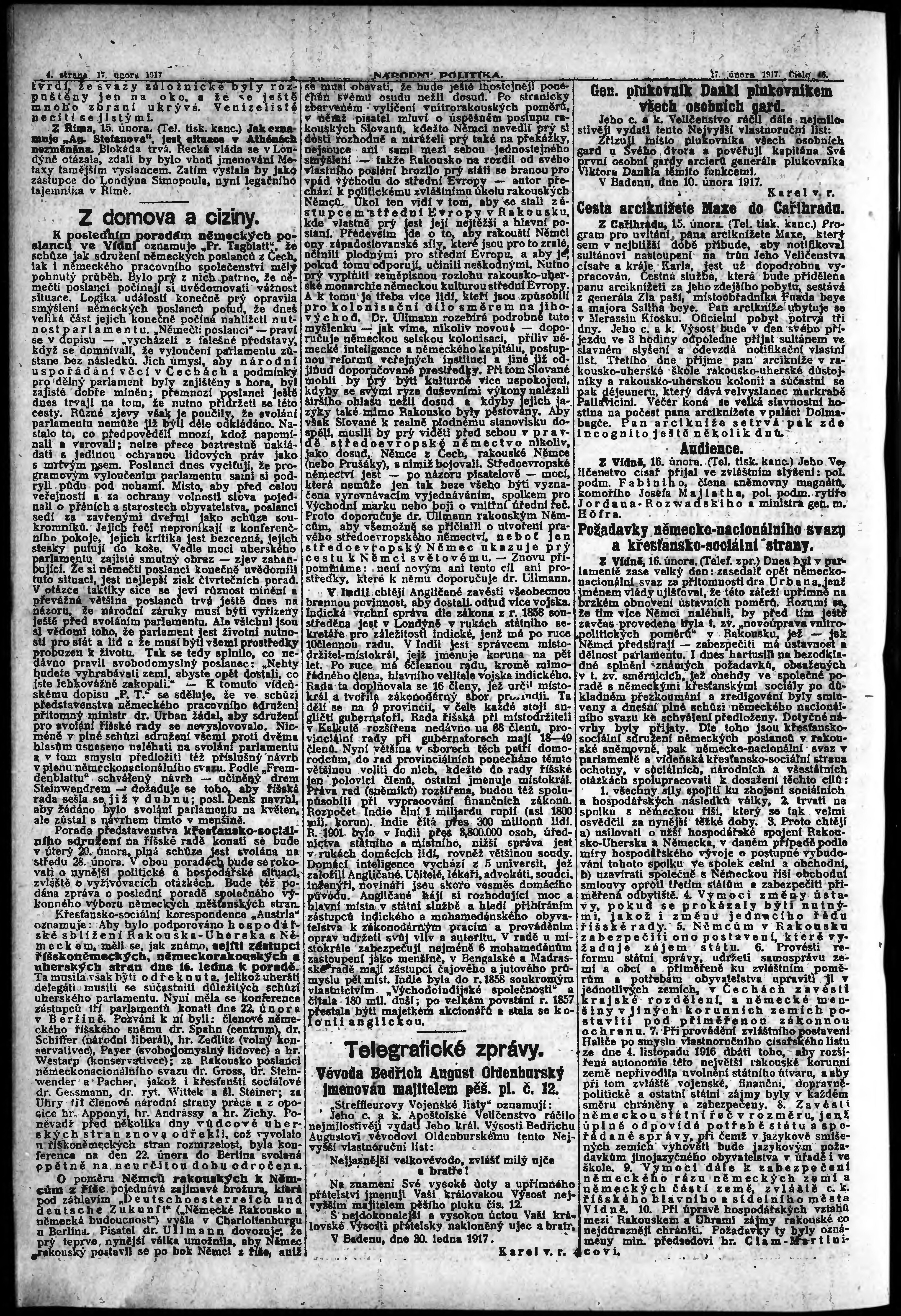 * Datum vydání výtisku: 17.2.1917 Číslo výtisku: 46 Poznámky k výtisku: ranní vydání; s. 9 - 10 není k dispozici;