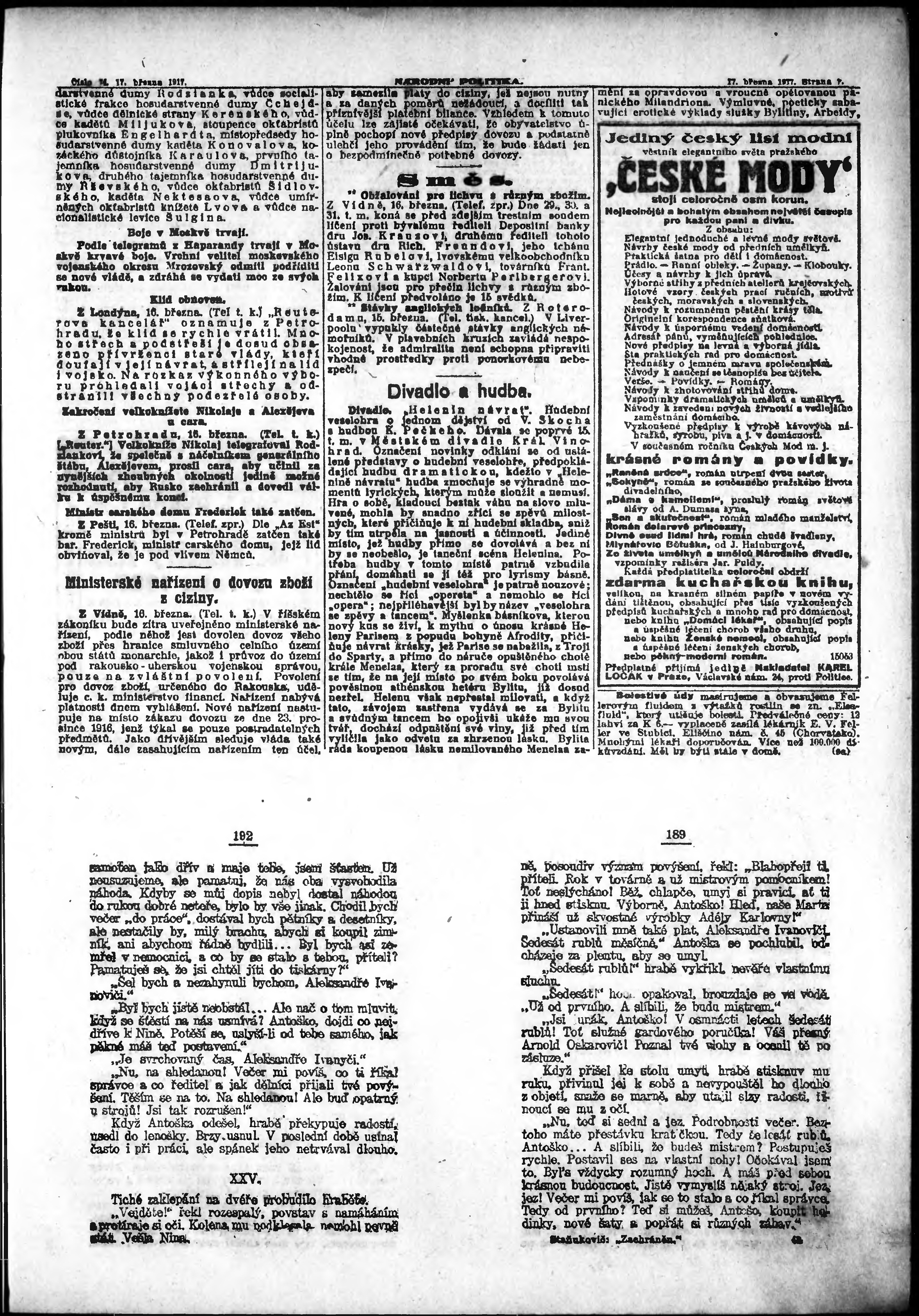 * Datum vydání výtisku: 17.3.1917 Číslo výtisku: 74 Poznámky k výtisku: ranní vydání;