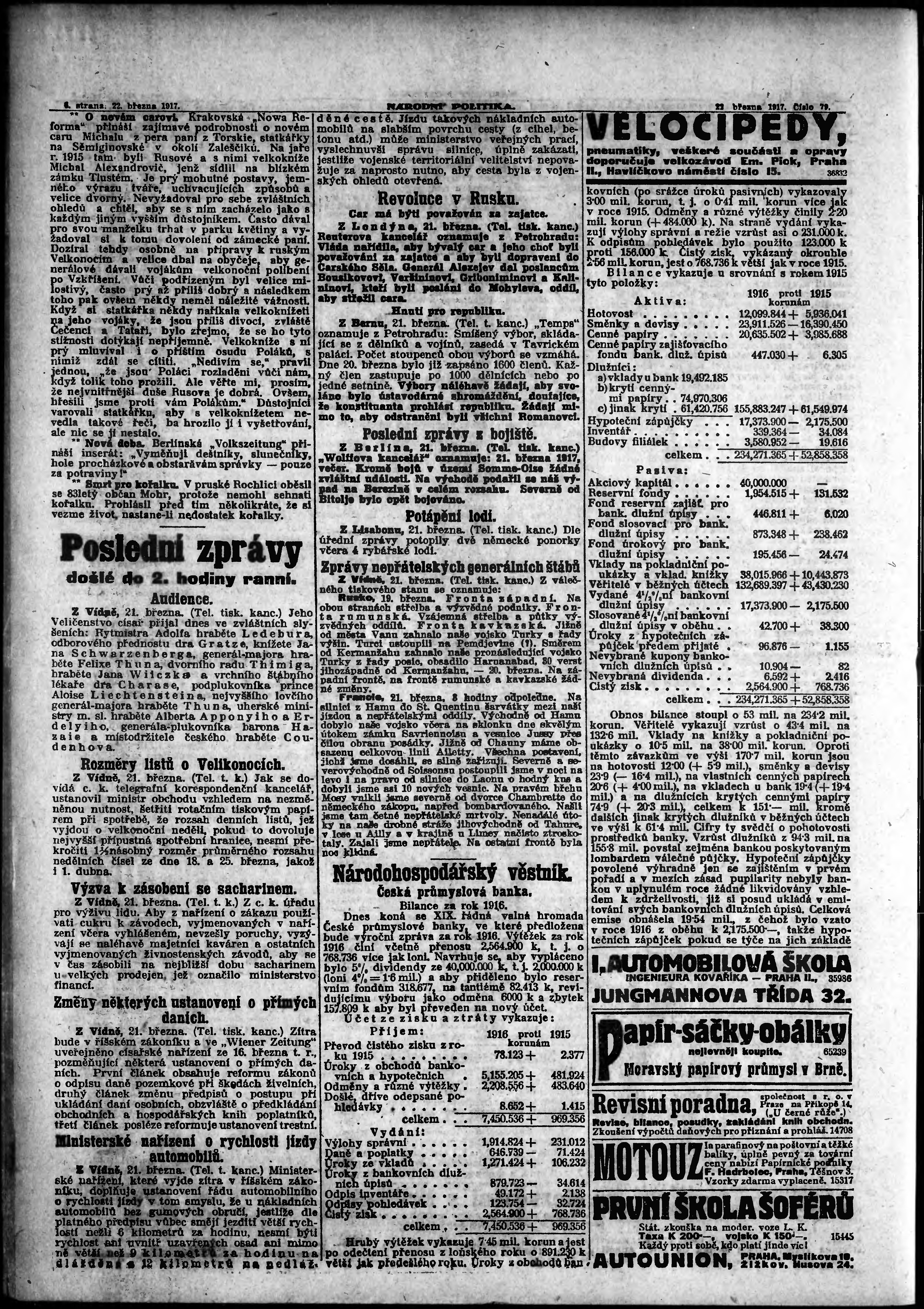 * Datum vydání výtisku: 22.3.1917 Číslo výtisku: 79 Poznámky k výtisku: ranní vydání; s. 9 - 10 není k dispozici;