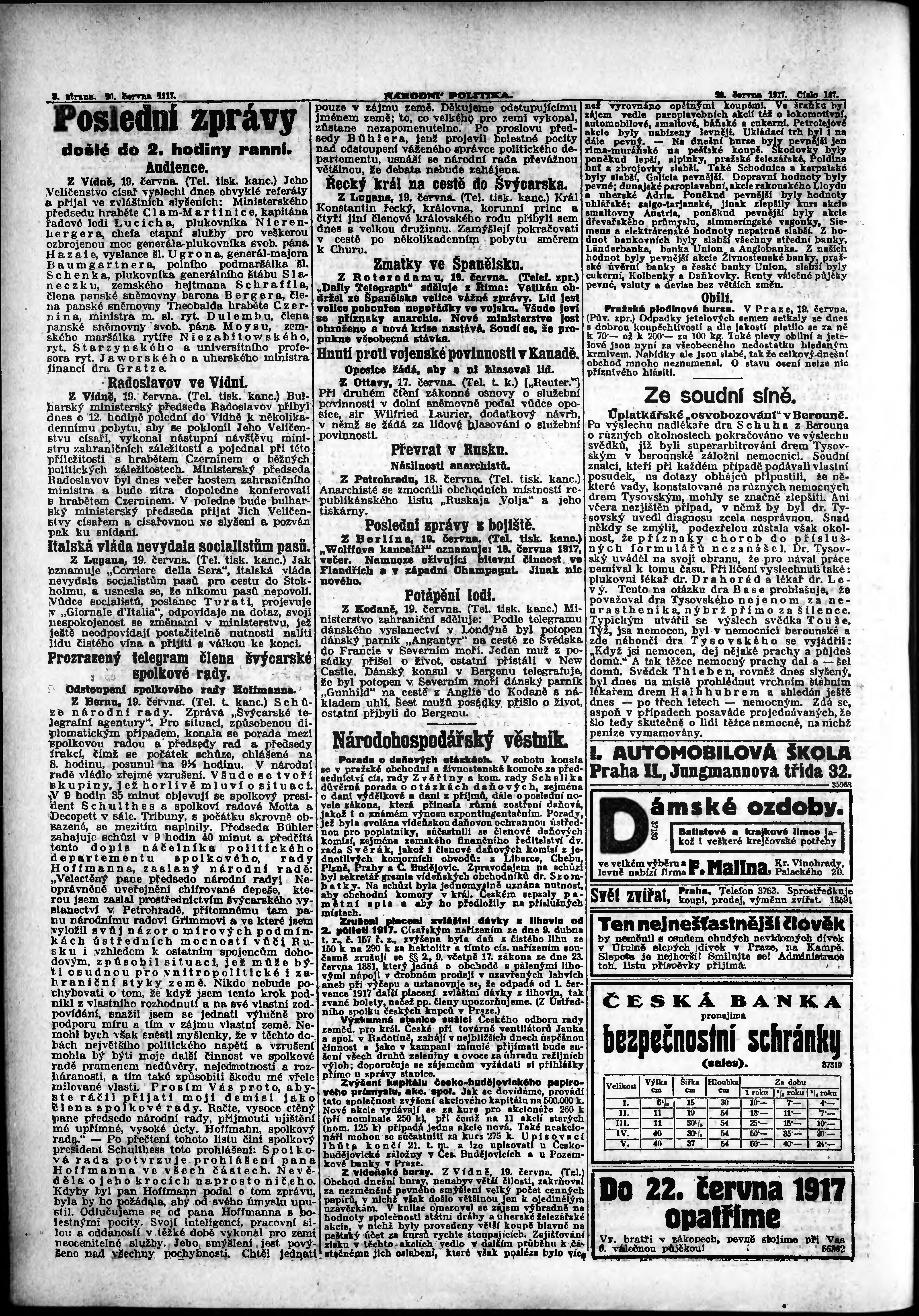 * Datum vydání výtisku: 20.6.1917 Číslo výtisku: 167 Poznámky k výtisku: ranní vydání;