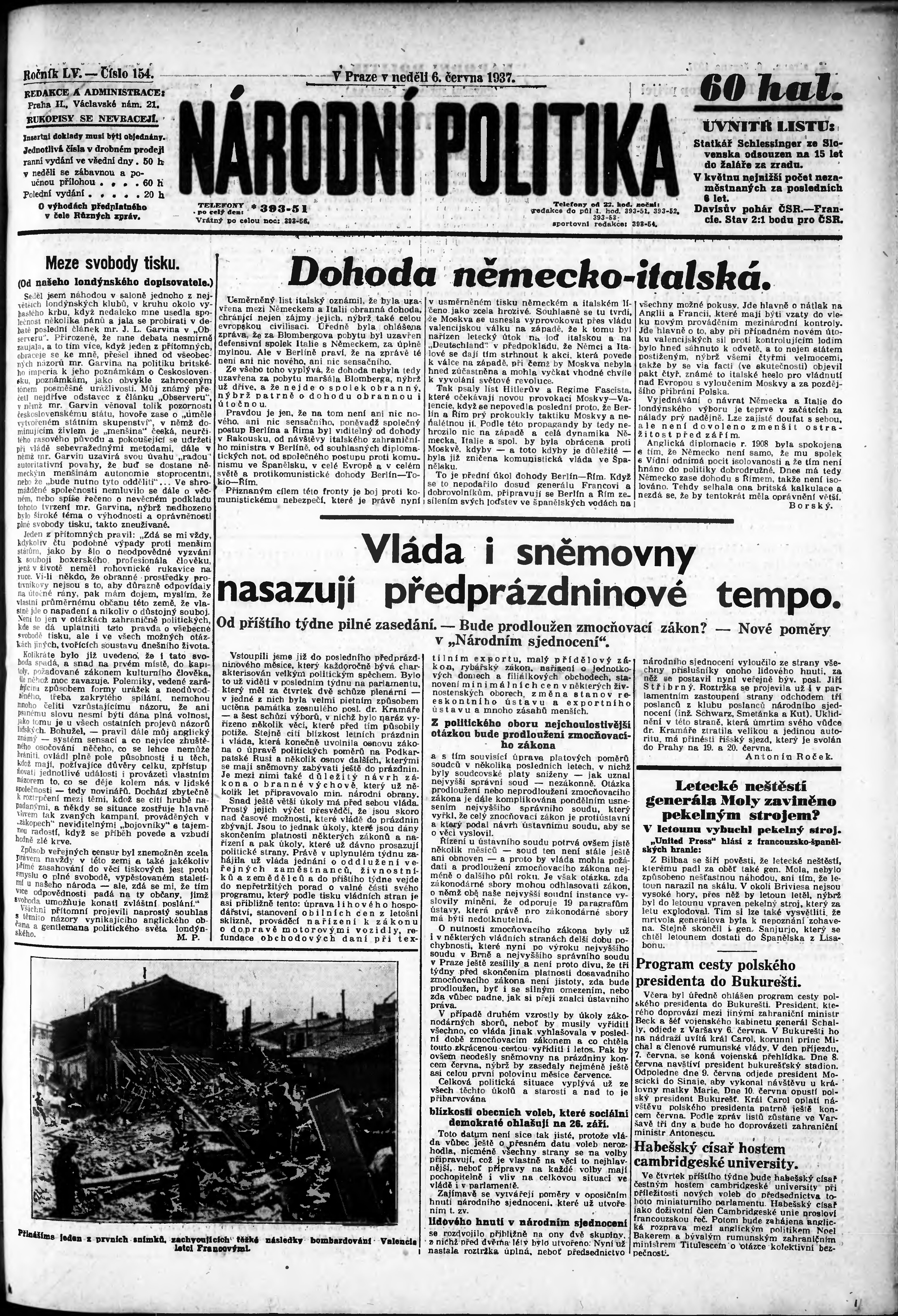 * Datum vydání výtisku: 6.6.1937 Číslo výtisku: 154 Poznámky k výtisku: ranní vydání;