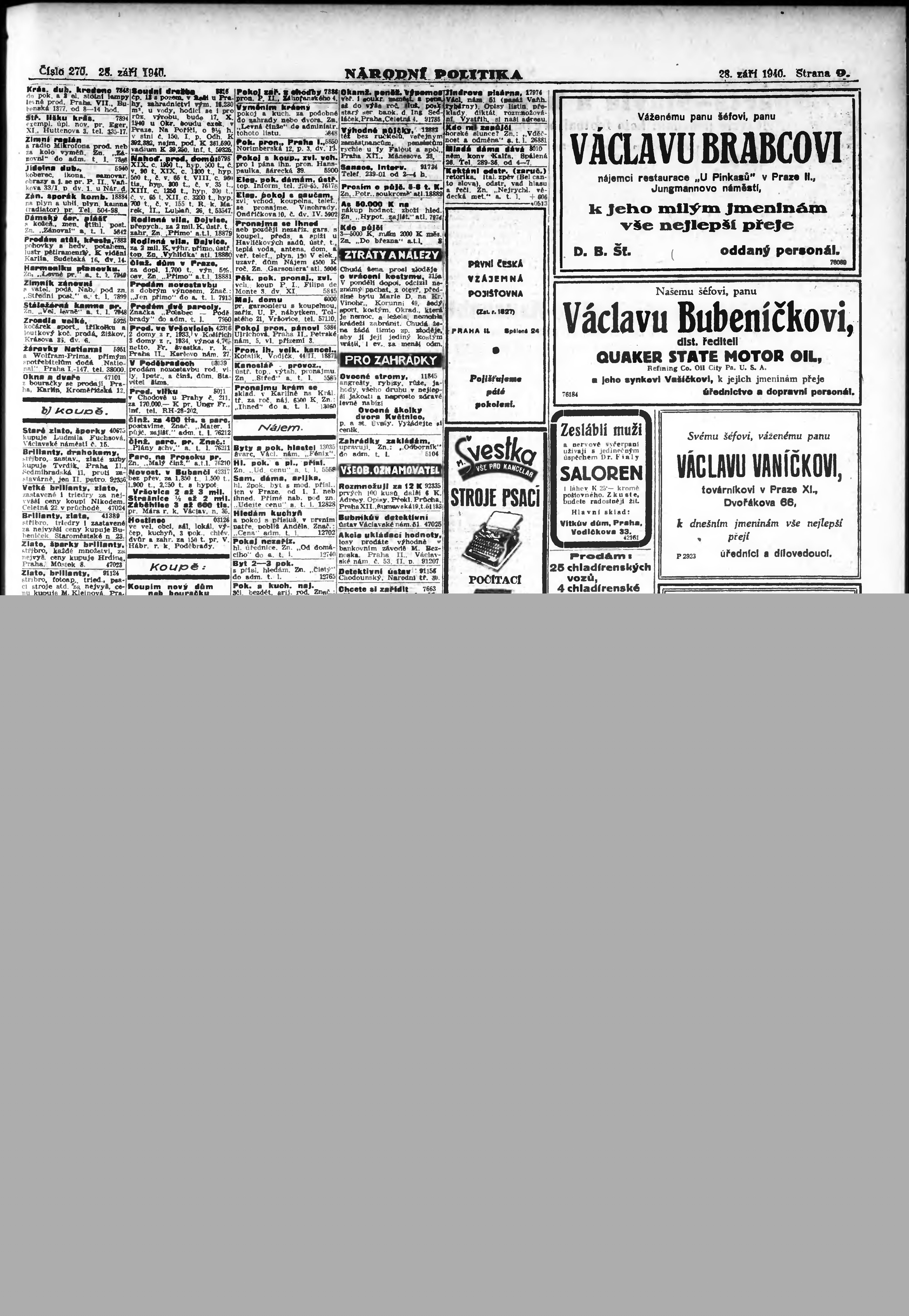 * Datum vydání výtisku: 28.9.1940 Číslo výtisku: 270 Poznámky k výtisku: ranní vydání; vydání pro Prahu;