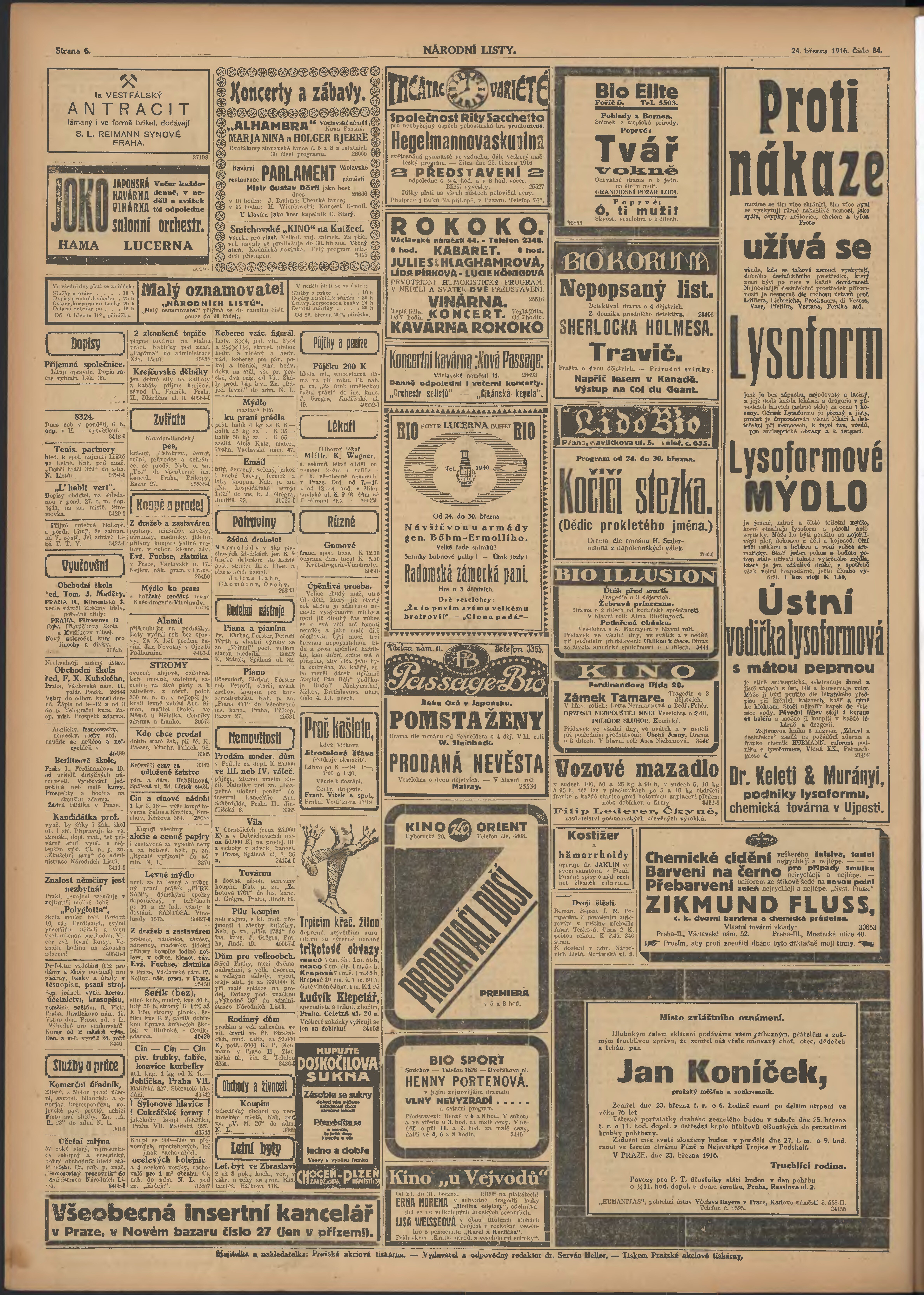 * Datum vydání výtisku: 24.3.1916 Číslo výtisku: 84 Poznámky k výtisku: ranní vydání; 2. vydání pro Prahu;