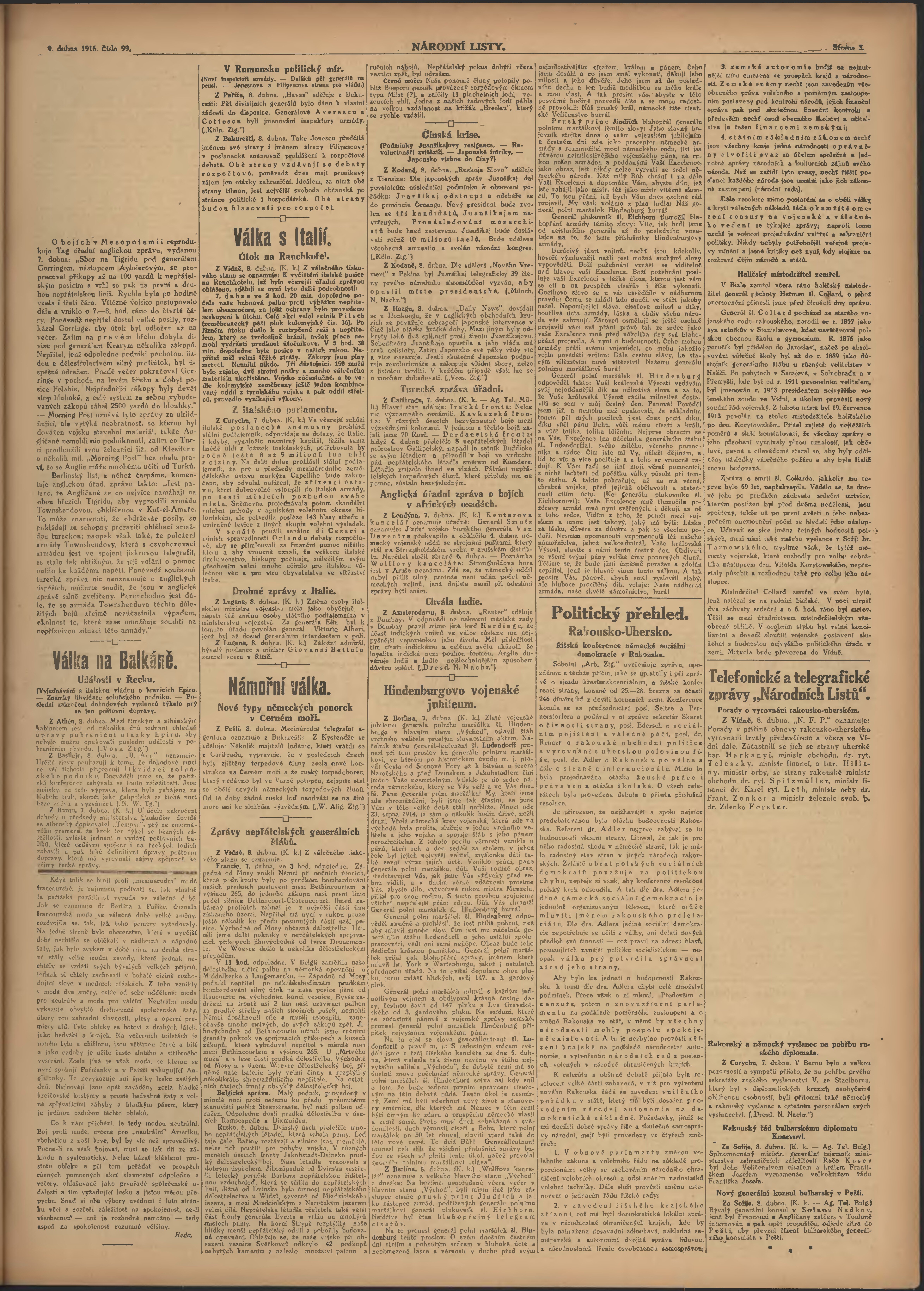 * Datum vydání výtisku: 9.4.1916 Číslo výtisku: 99 Poznámky k výtisku: ranní vydání; 2. vydání pro Prahu;
