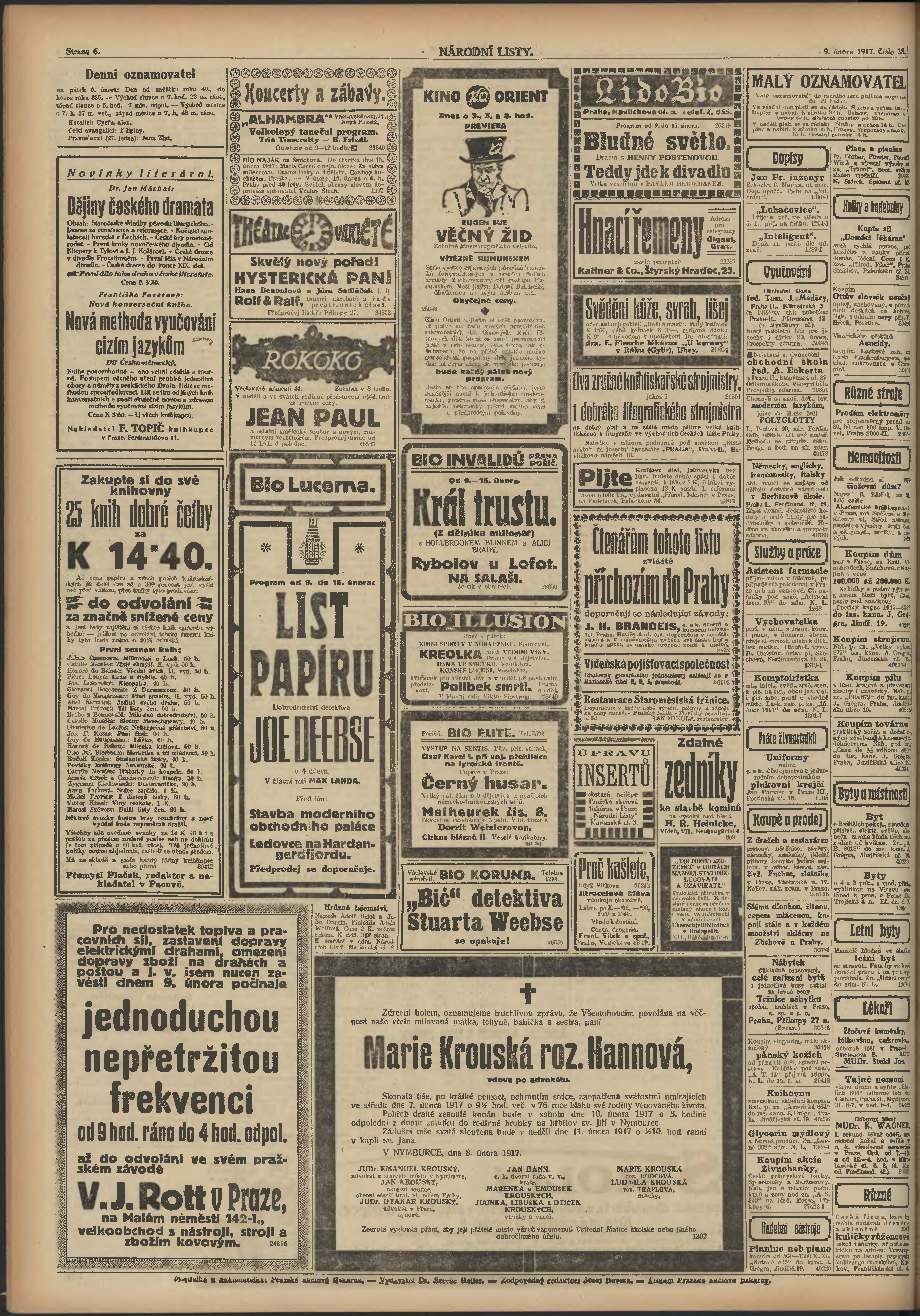 * Datum vydání výtisku: 9.2.1917 Číslo výtisku: 38 Poznámky k výtisku: ranní vydání; 1. vydání;