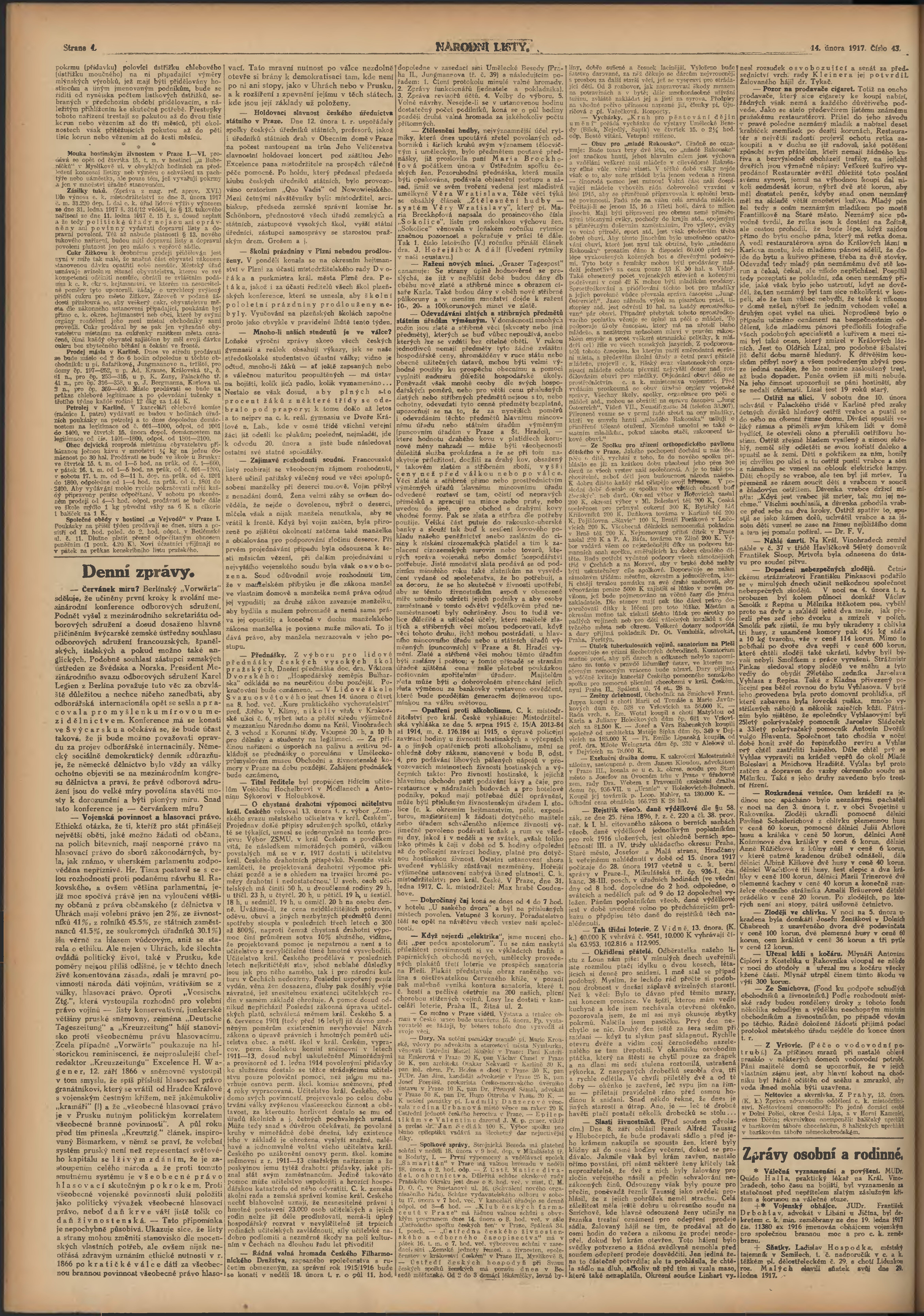 * Datum vydání výtisku: 14.2.1917 Číslo výtisku: 43 Poznámky k výtisku: ranní vydání; 1. vydání;