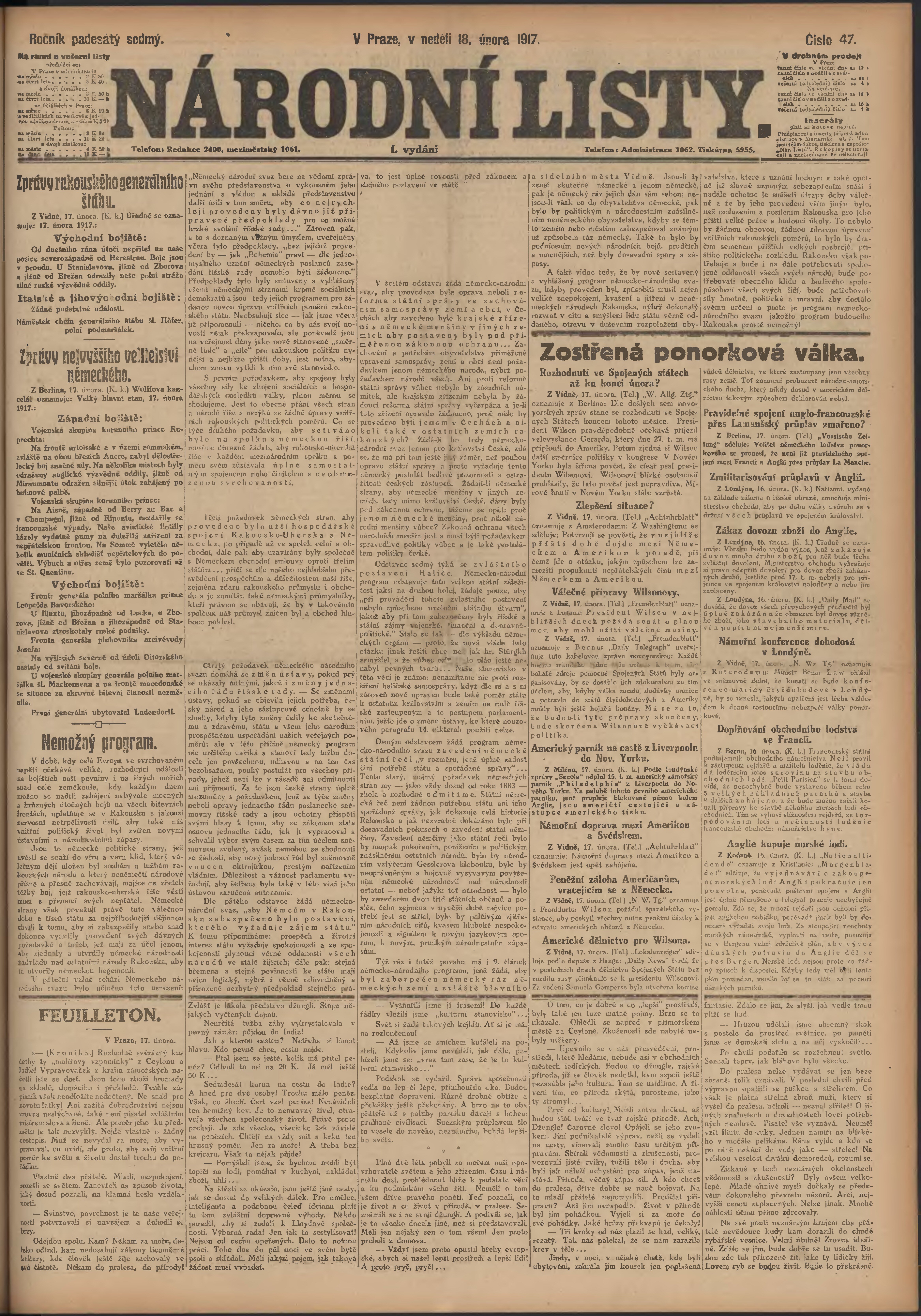 * Datum vydání výtisku: 18.2.1917 Číslo výtisku: 47 Poznámky k výtisku: ranní vydání; 1. vydání;