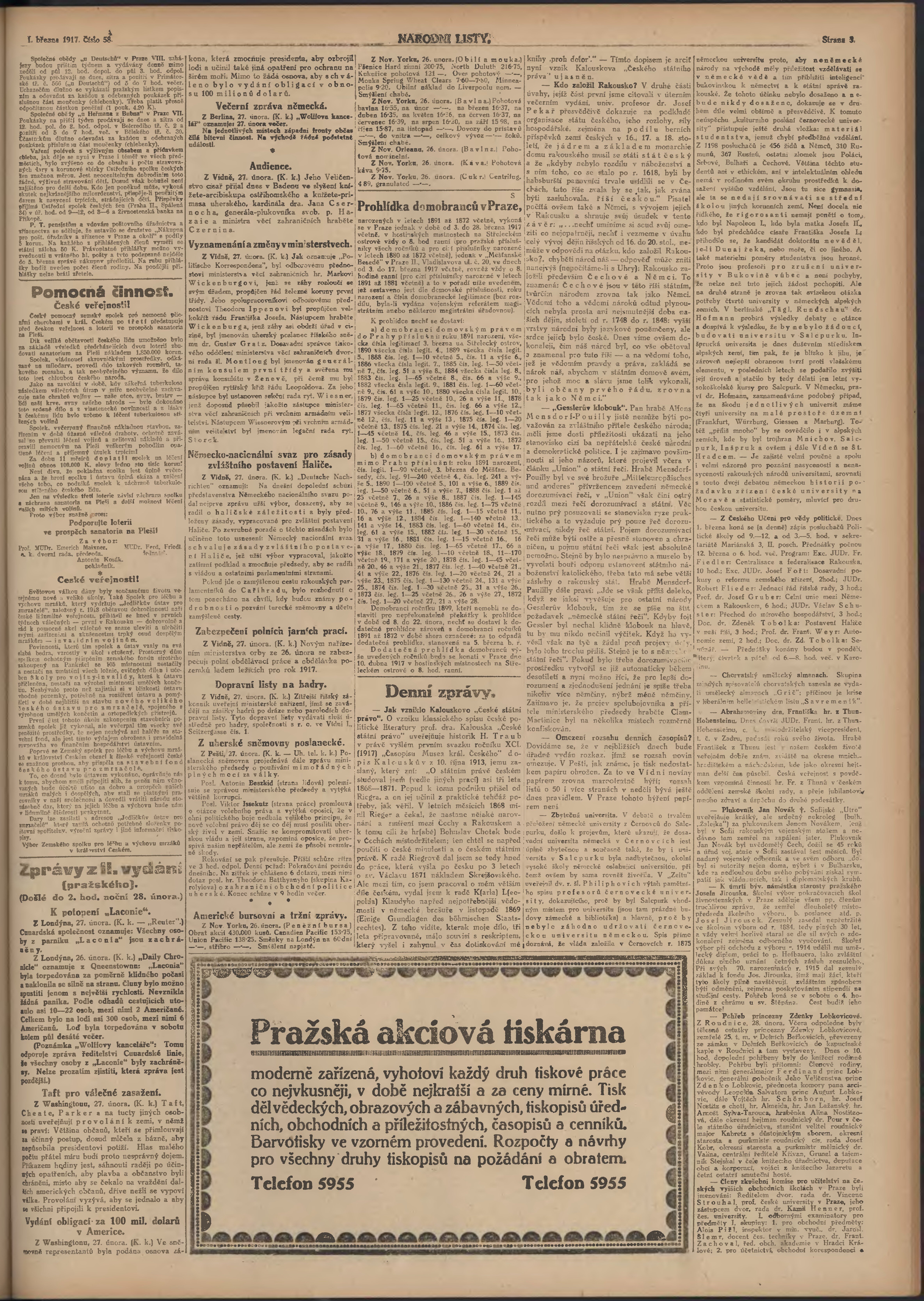 * Datum vydání výtisku: 1.3.1917 Číslo výtisku: 58 Poznámky k výtisku: ranní vydání; 1. vydání;
