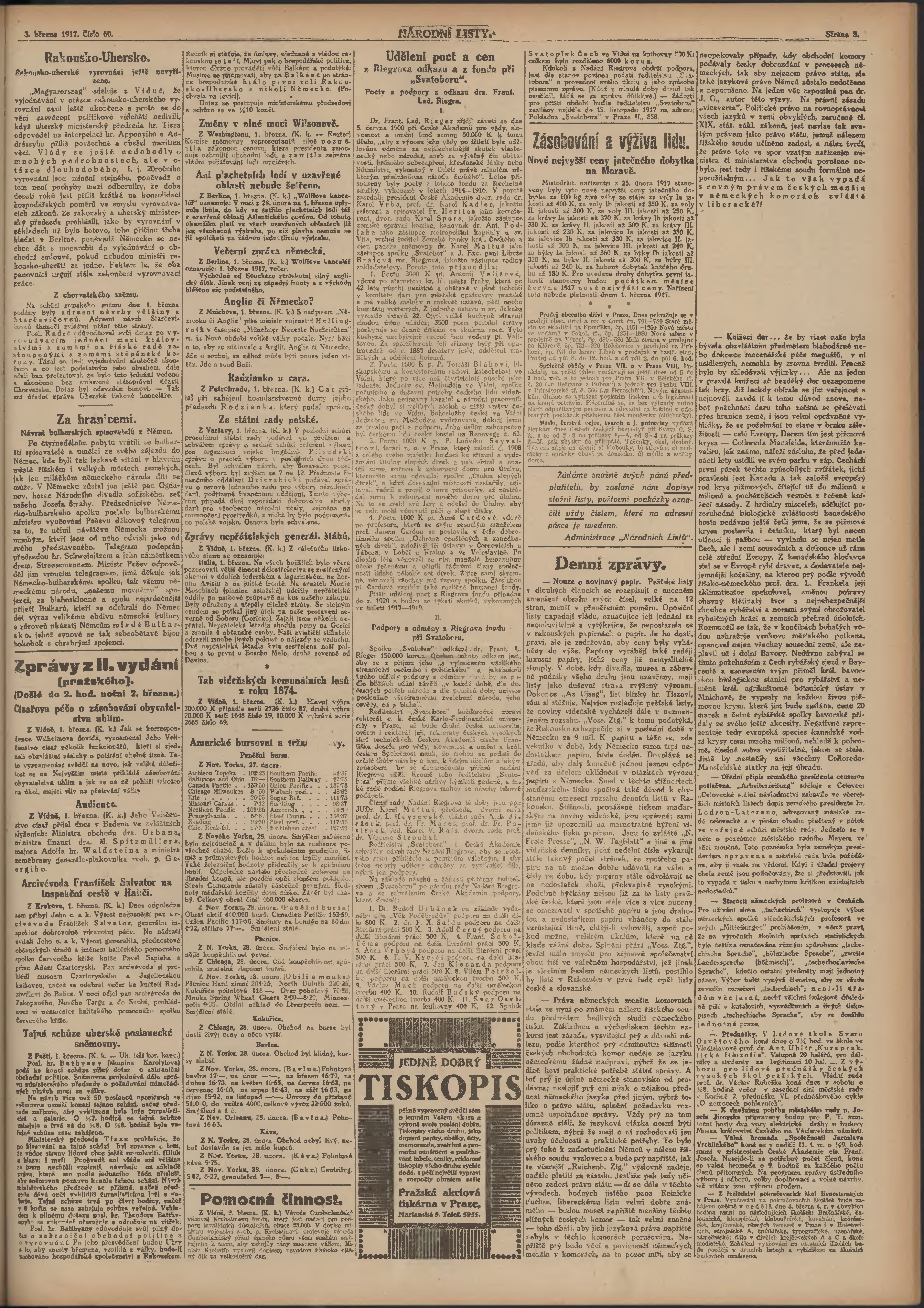 * Datum vydání výtisku: 3.3.1917 Číslo výtisku: 60 Poznámky k výtisku: ranní vydání; 1. vydání;