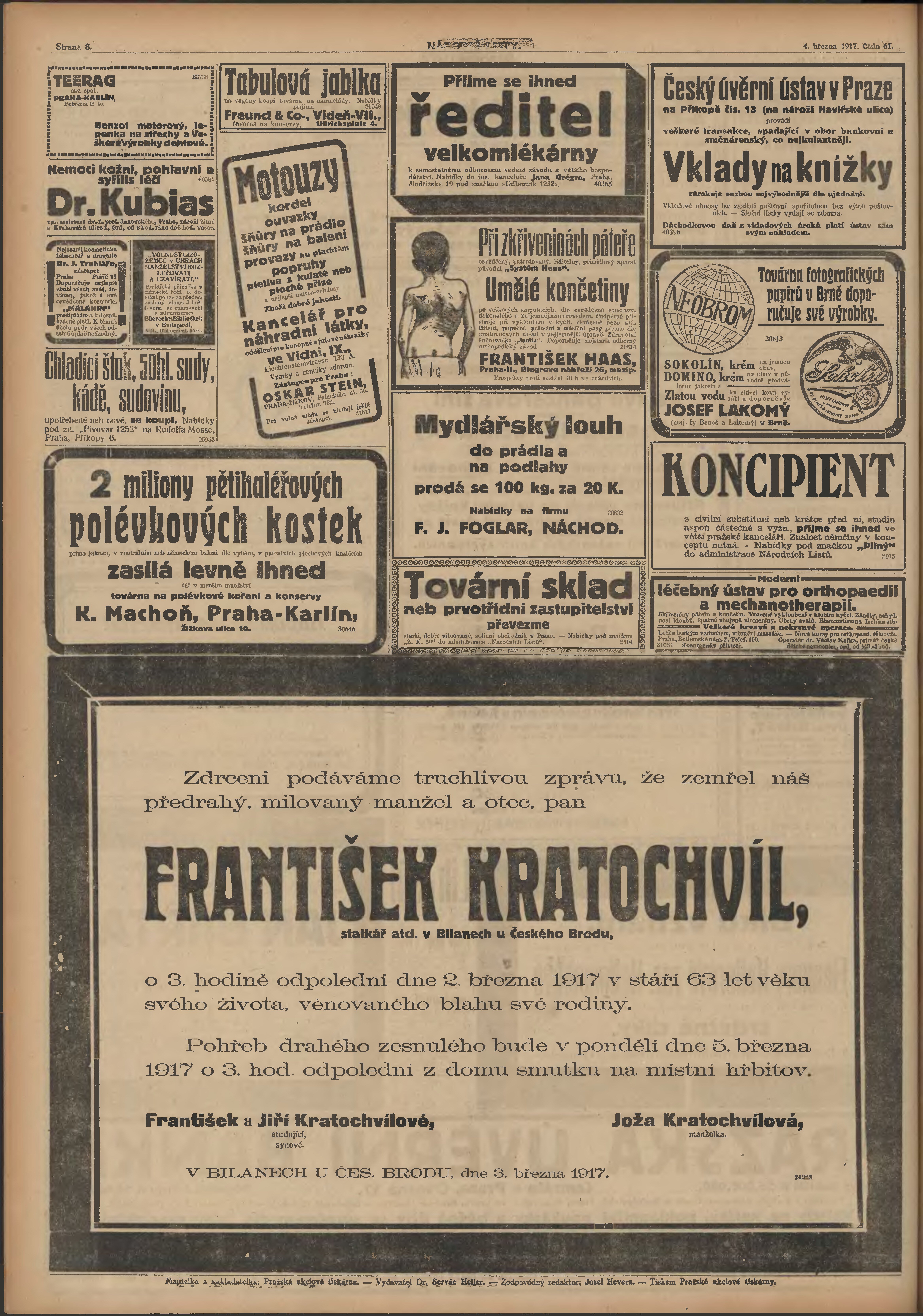 * Datum vydání výtisku: 4.3.1917 Číslo výtisku: 61 Poznámky k výtisku: ranní vydání; 1. vydání;