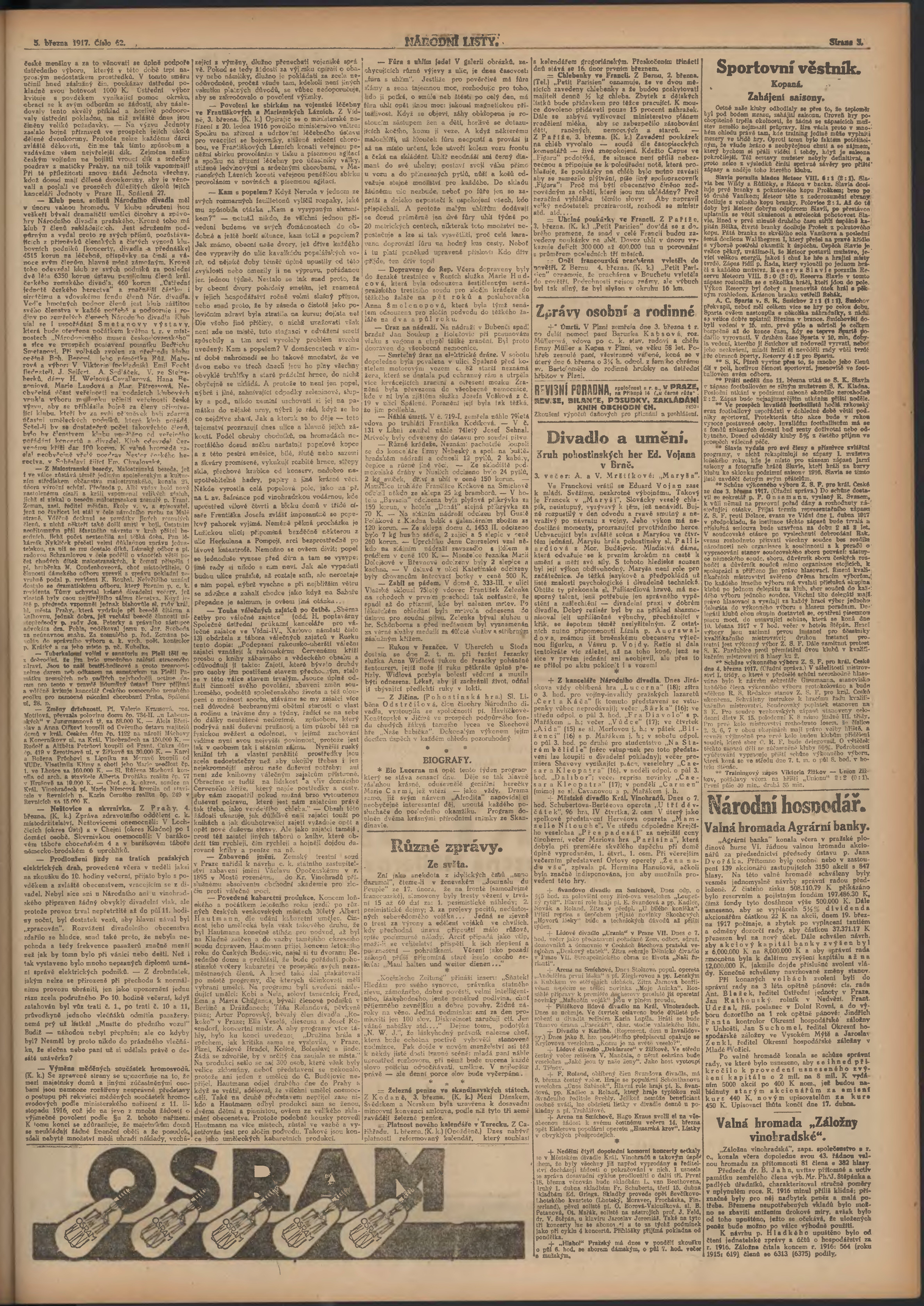 * Datum vydání výtisku: 5.3.1917 Číslo výtisku: 62 Poznámky k výtisku: ranní vydání;