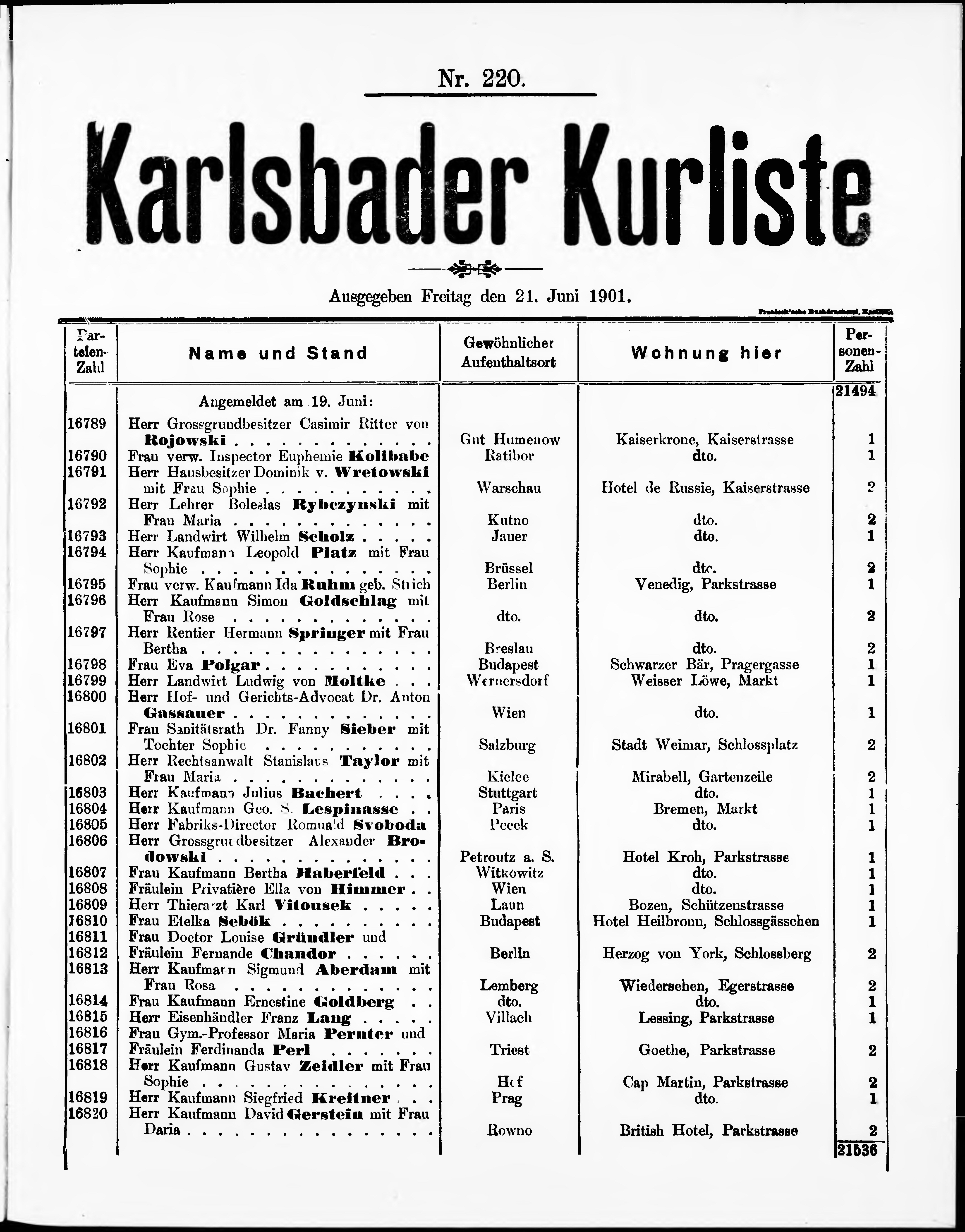 Liste der im Jahre ... angekommenen und abgereisten Kur- und Badegäste in Karlsb...