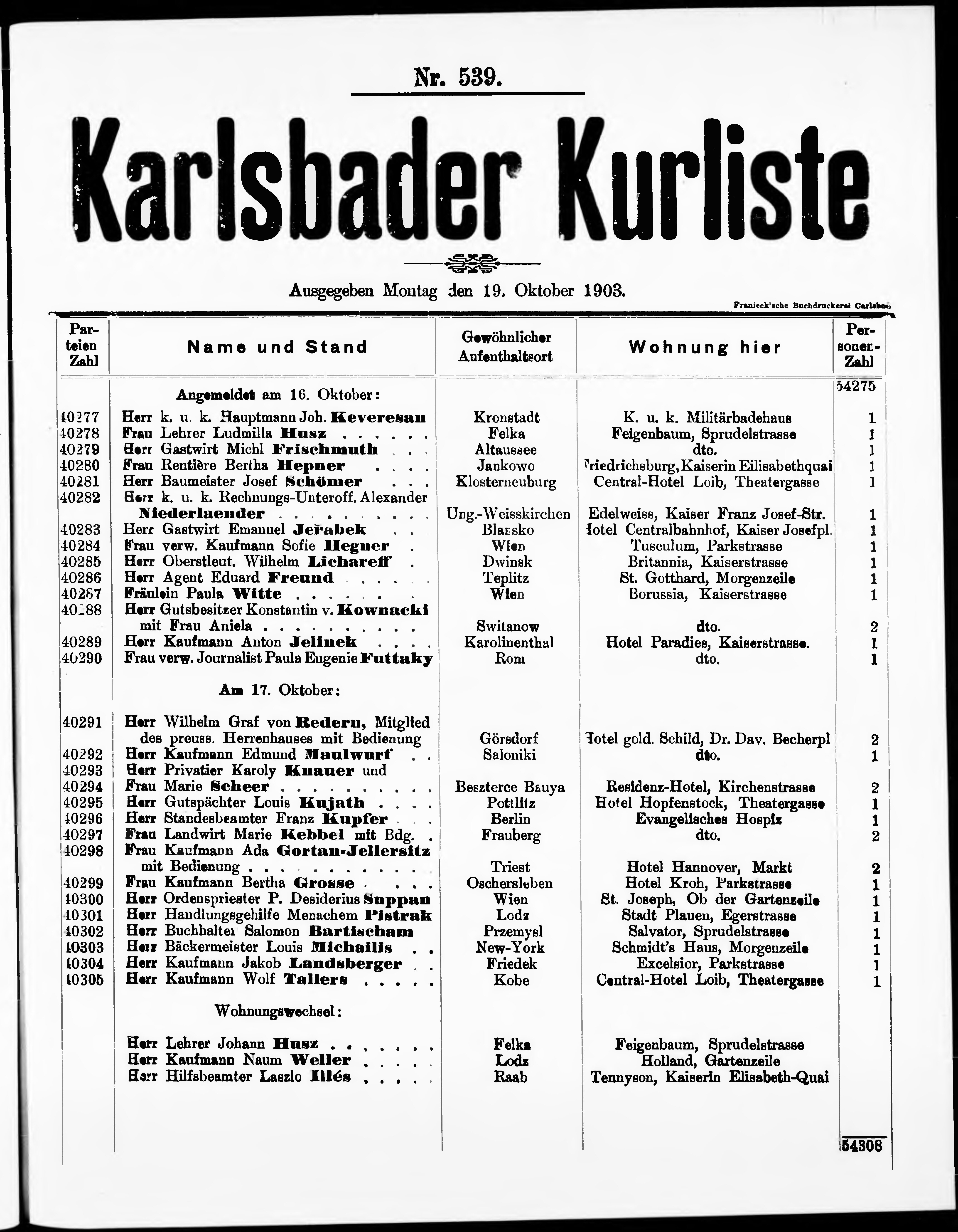 Liste der im Jahre ... angekommenen und abgereisten Kur- und Badegäste in Karlsb...