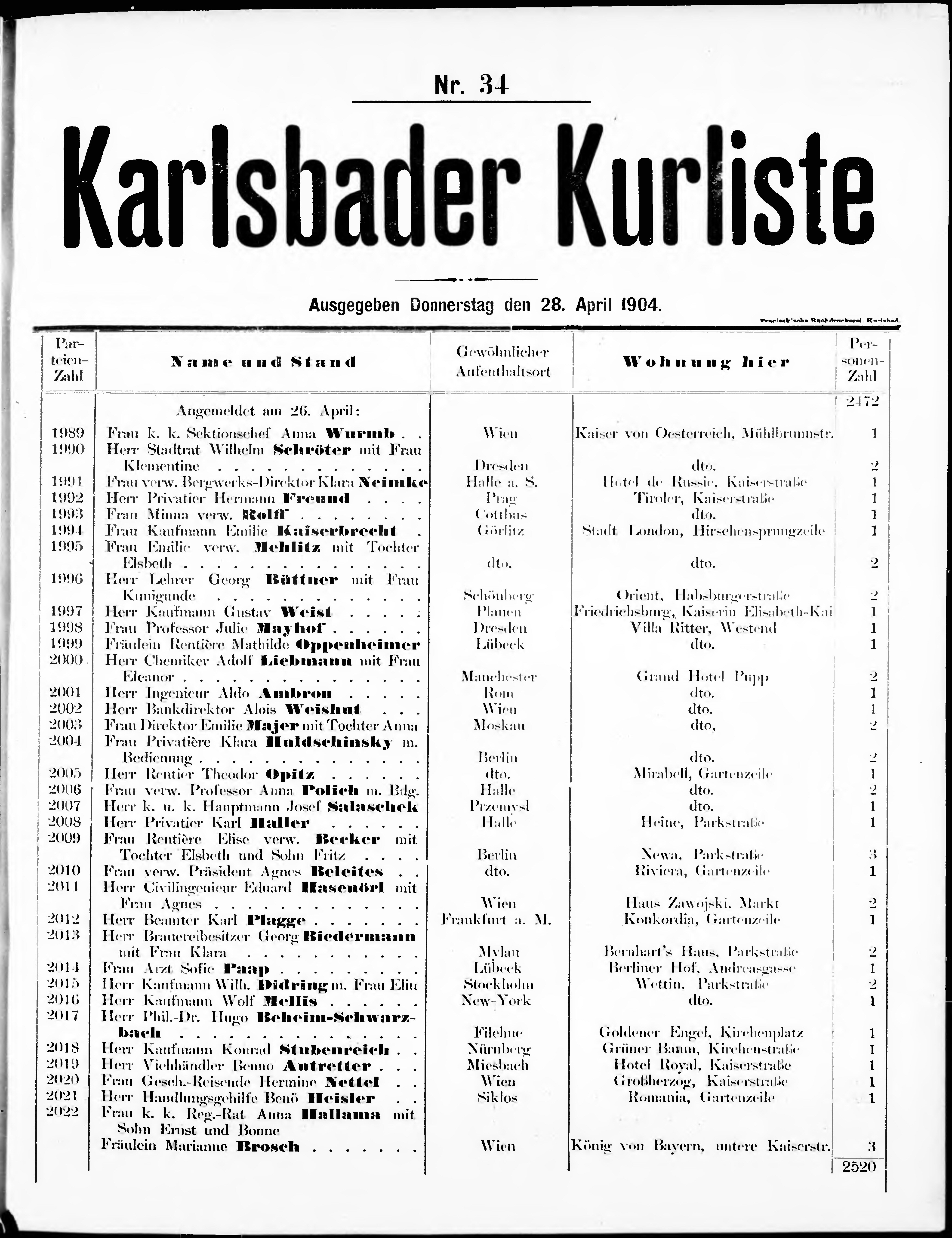 Liste der angekommenen und abgereisten P. T. Curgäste in Carlsbad im Jahre