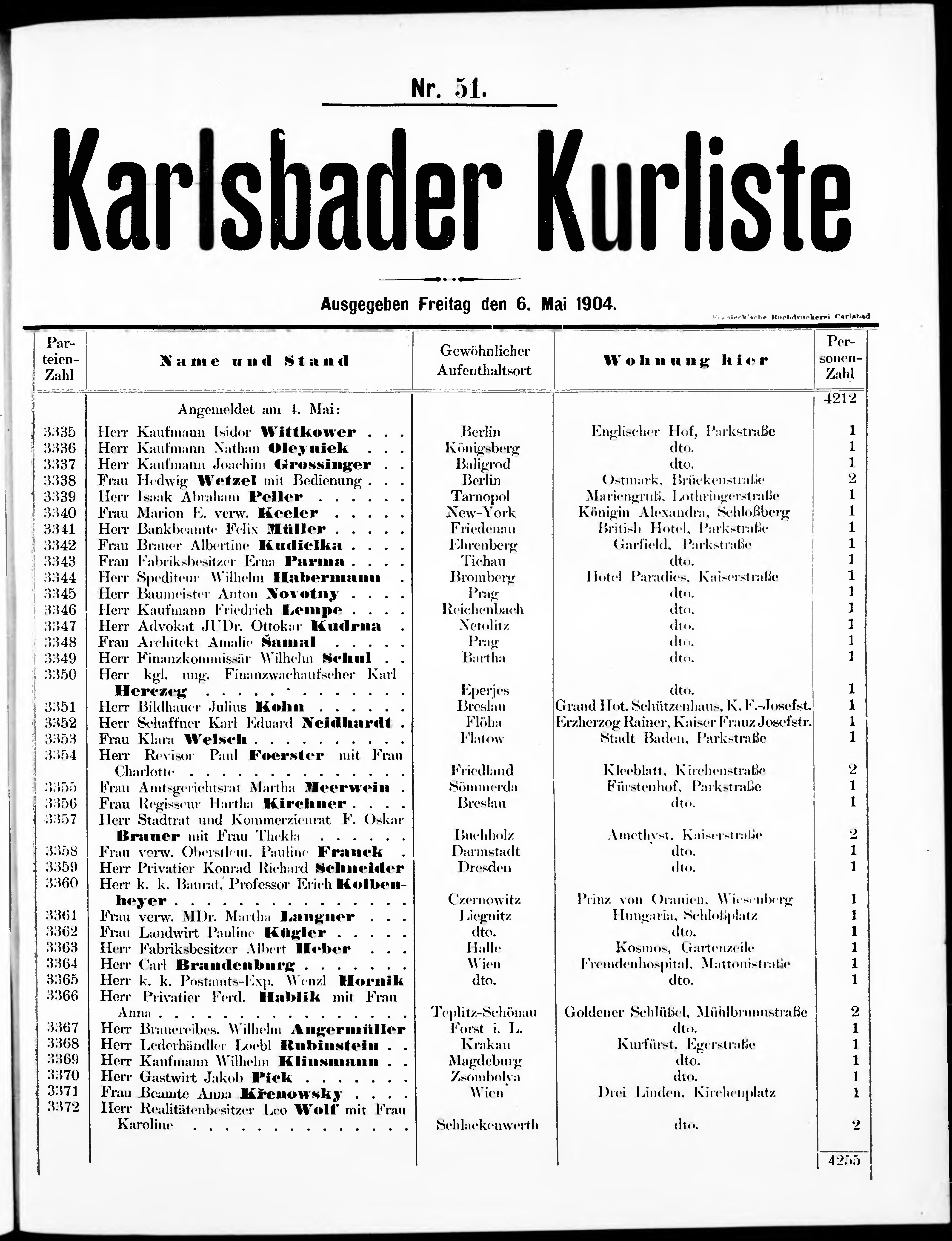 Liste der im Jahre ... angekommenen und abgereisten Kur- und Badegäste in Karlsb...