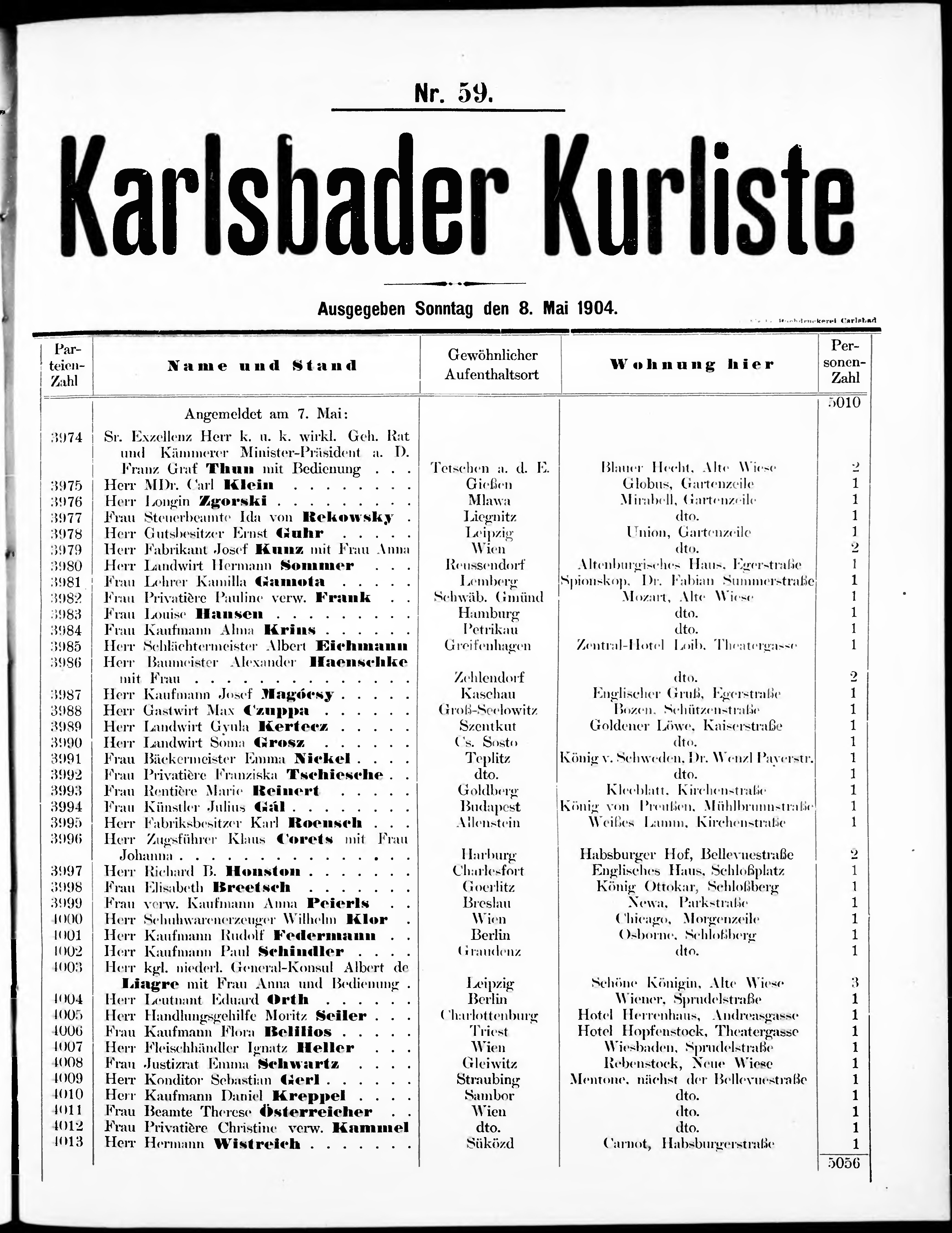 Liste der im Jahre ... angekommenen und abgereisten Kur- und Badegäste in Karlsb...