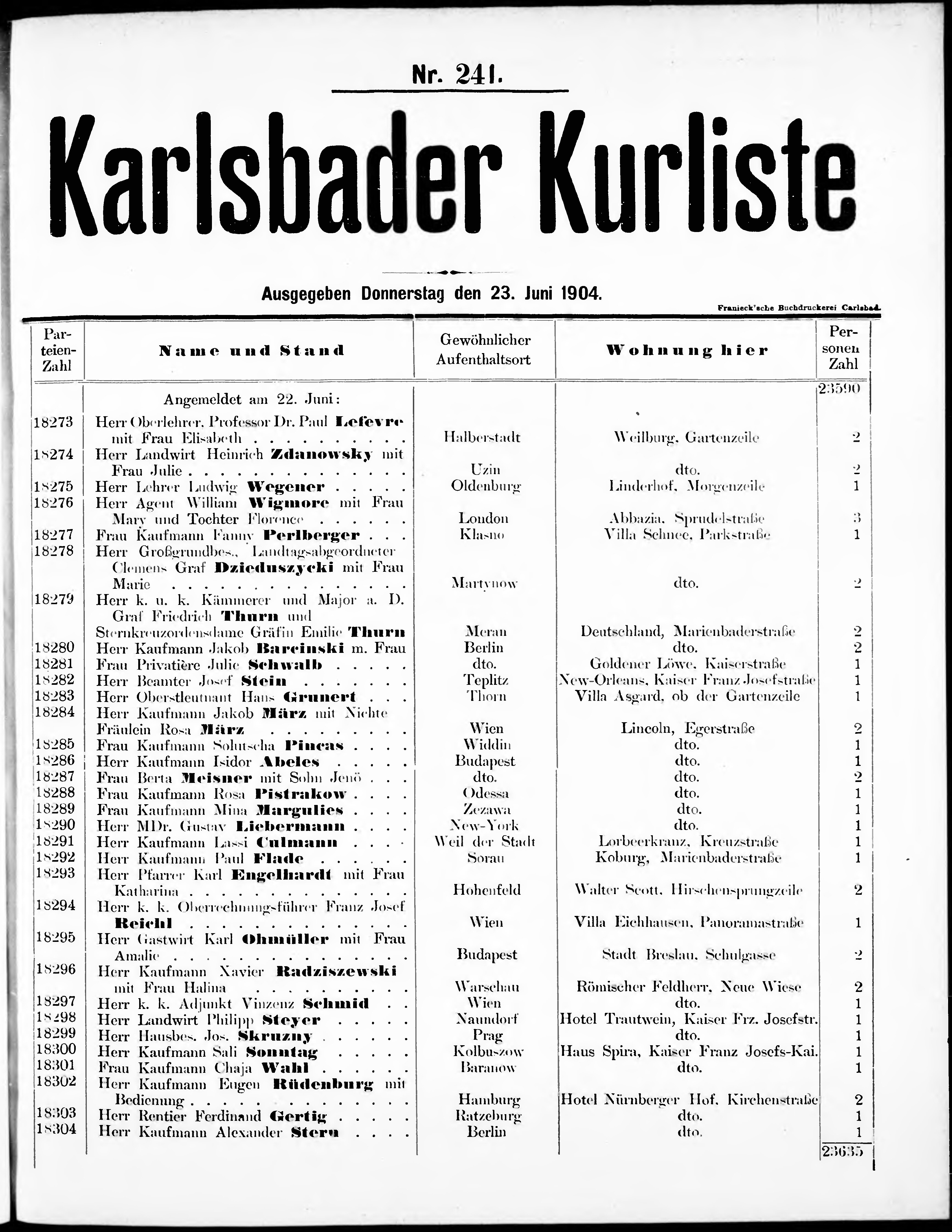 Liste der im Jahre ... angekommenen und abgereisten Kur- und Badegäste in Karlsb...