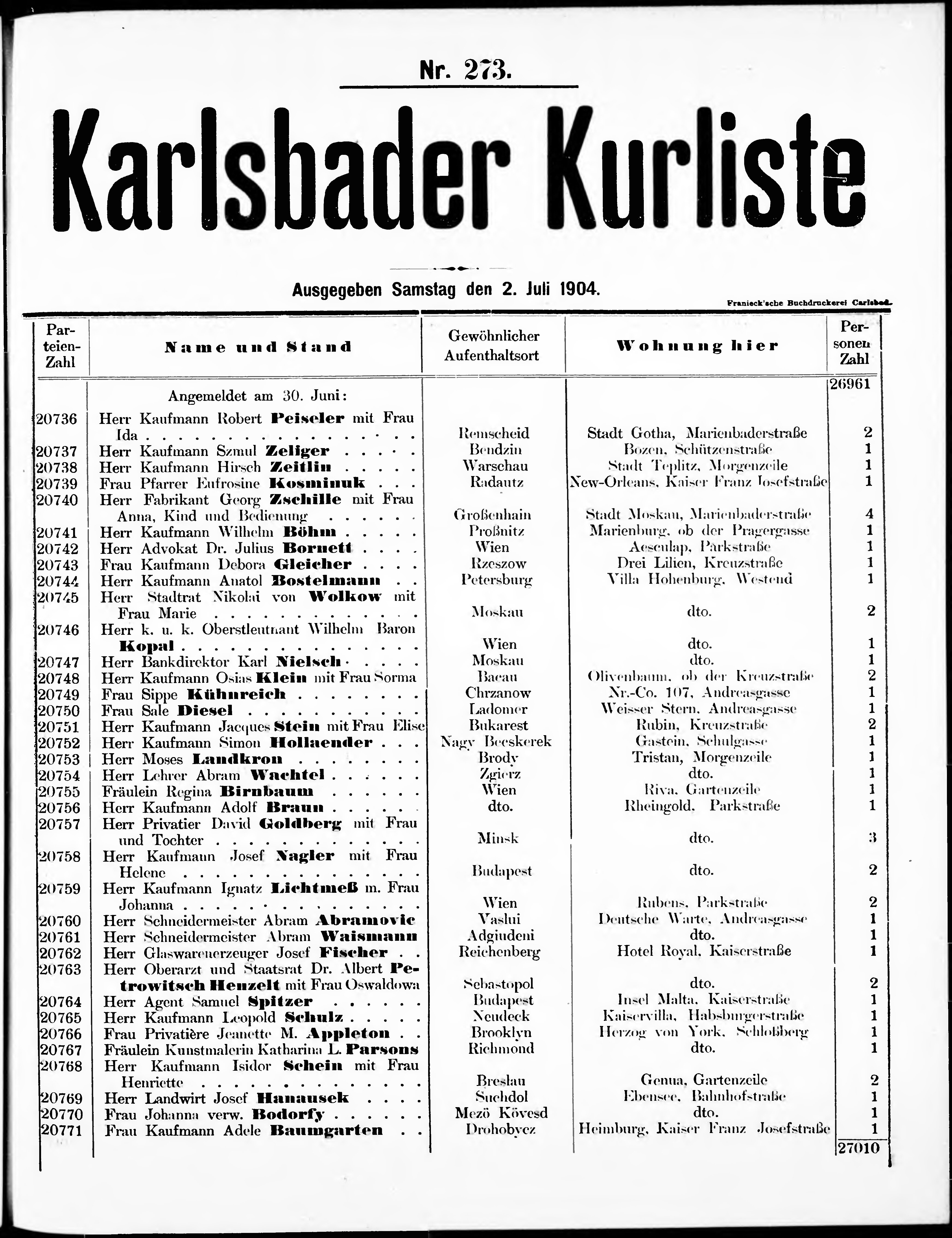 Liste der im Jahre ... angekommenen und abgereisten Kur- und Badegäste in Karlsb...