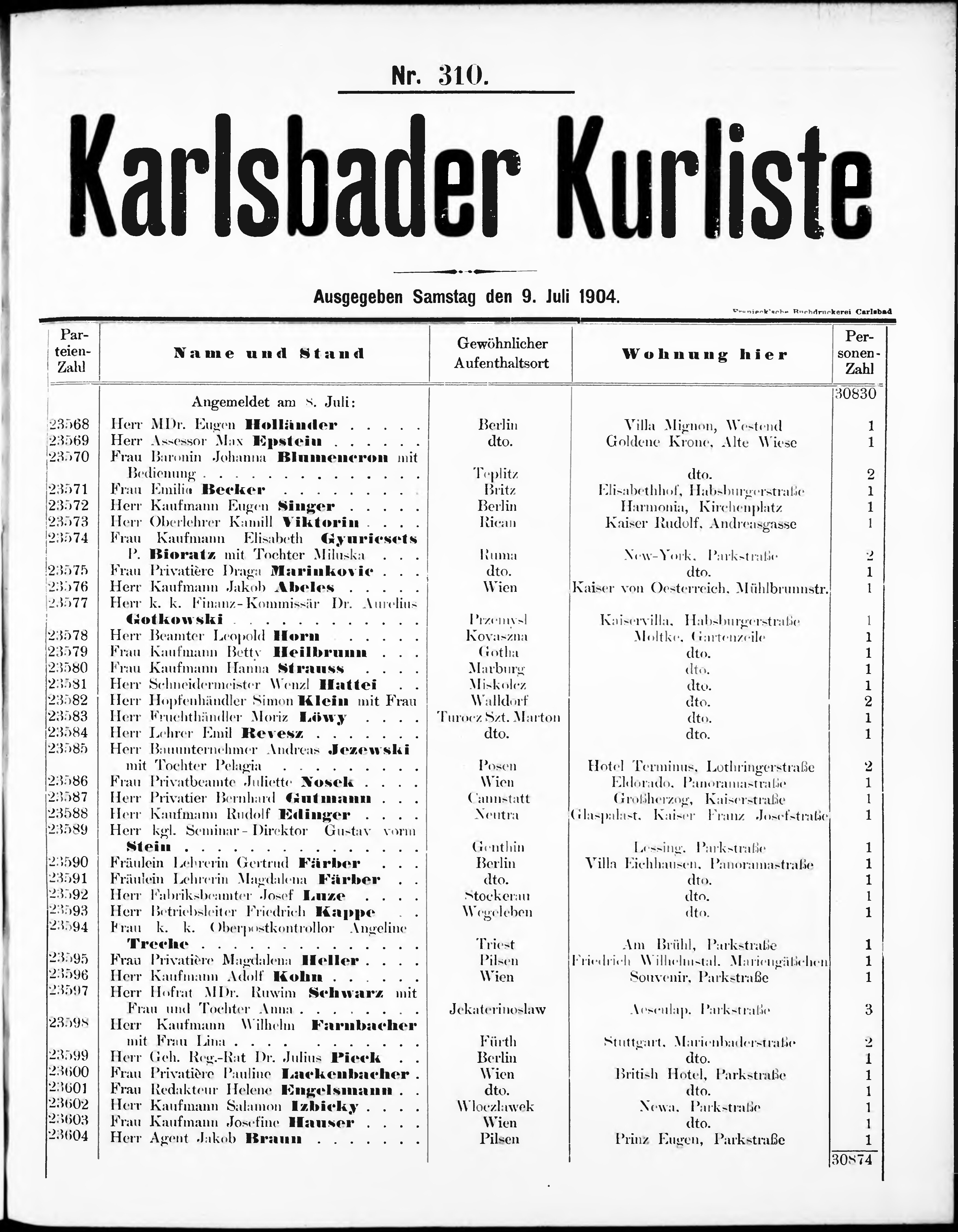 Liste der angekommenen und abgereisten P. T. Curgäste in Carlsbad im Jahre