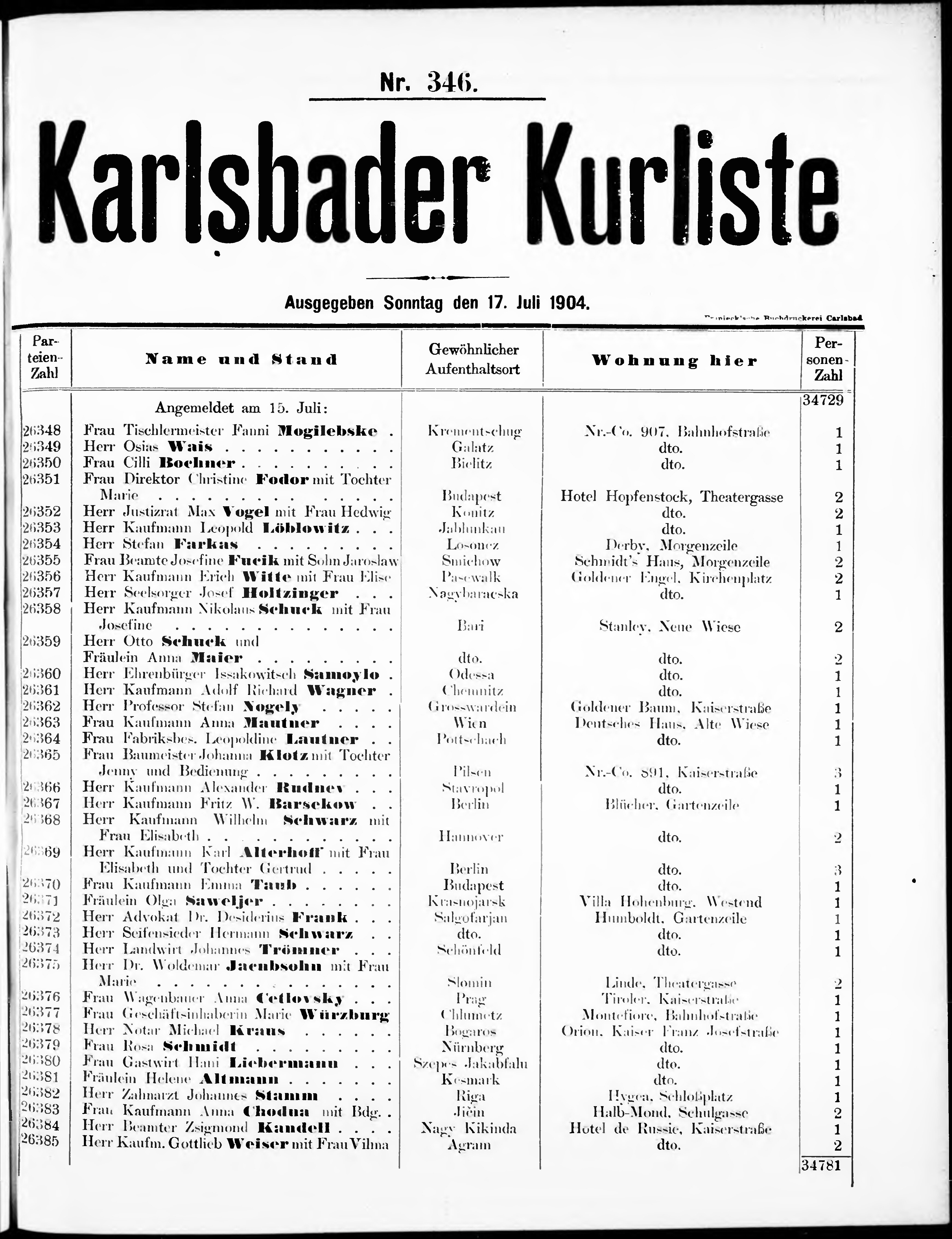 Liste der angekommenen und abgereisten P. T. Curgäste in Carlsbad im Jahre