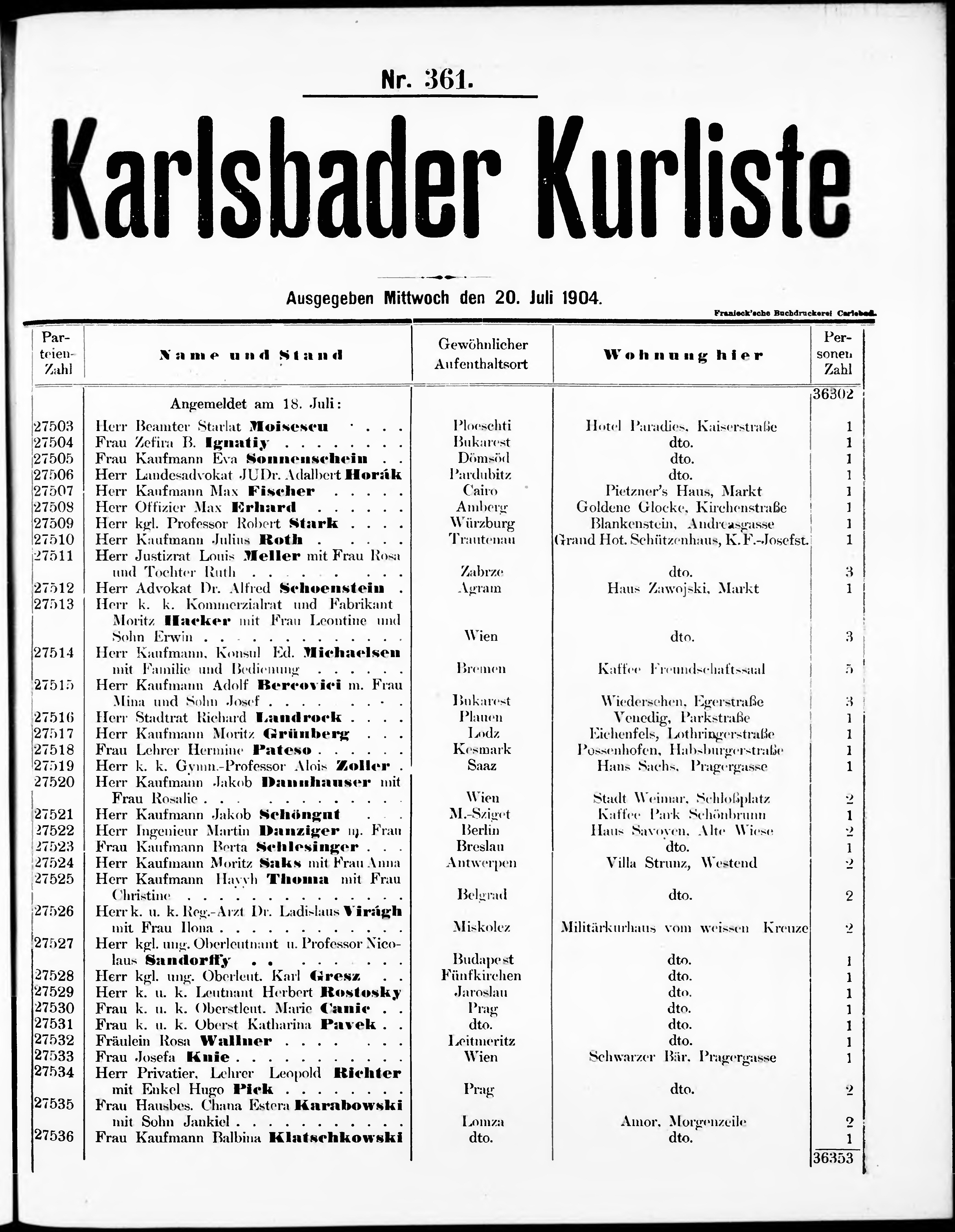 Liste der angekommenen und abgereisten P. T. Curgäste in Carlsbad im Jahre