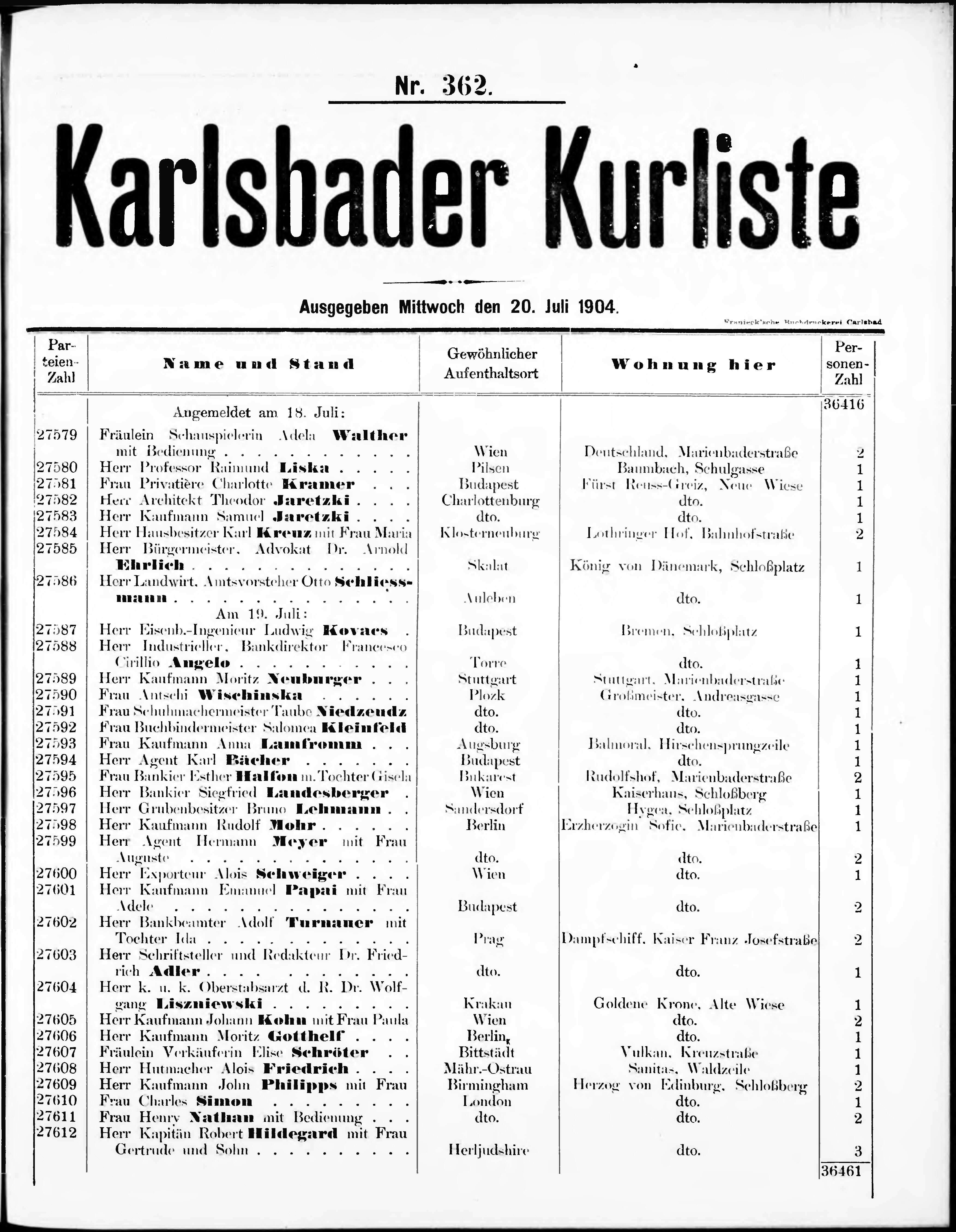 Liste der im Jahre ... angekommenen und abgereisten Kur- und Badegäste in Karlsb...