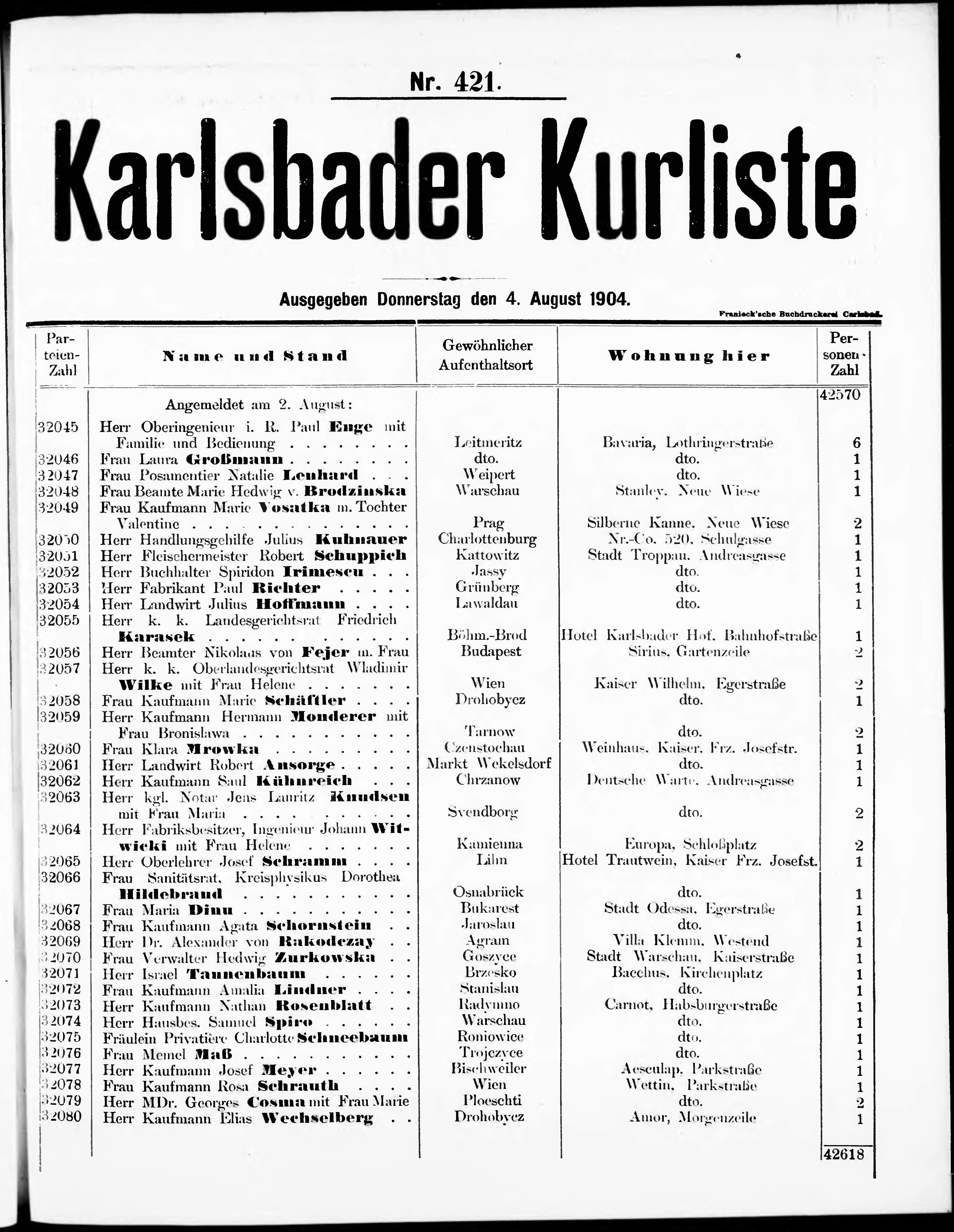 Liste der angekommenen und abgereisten P. T. Curgäste in Carlsbad im Jahre