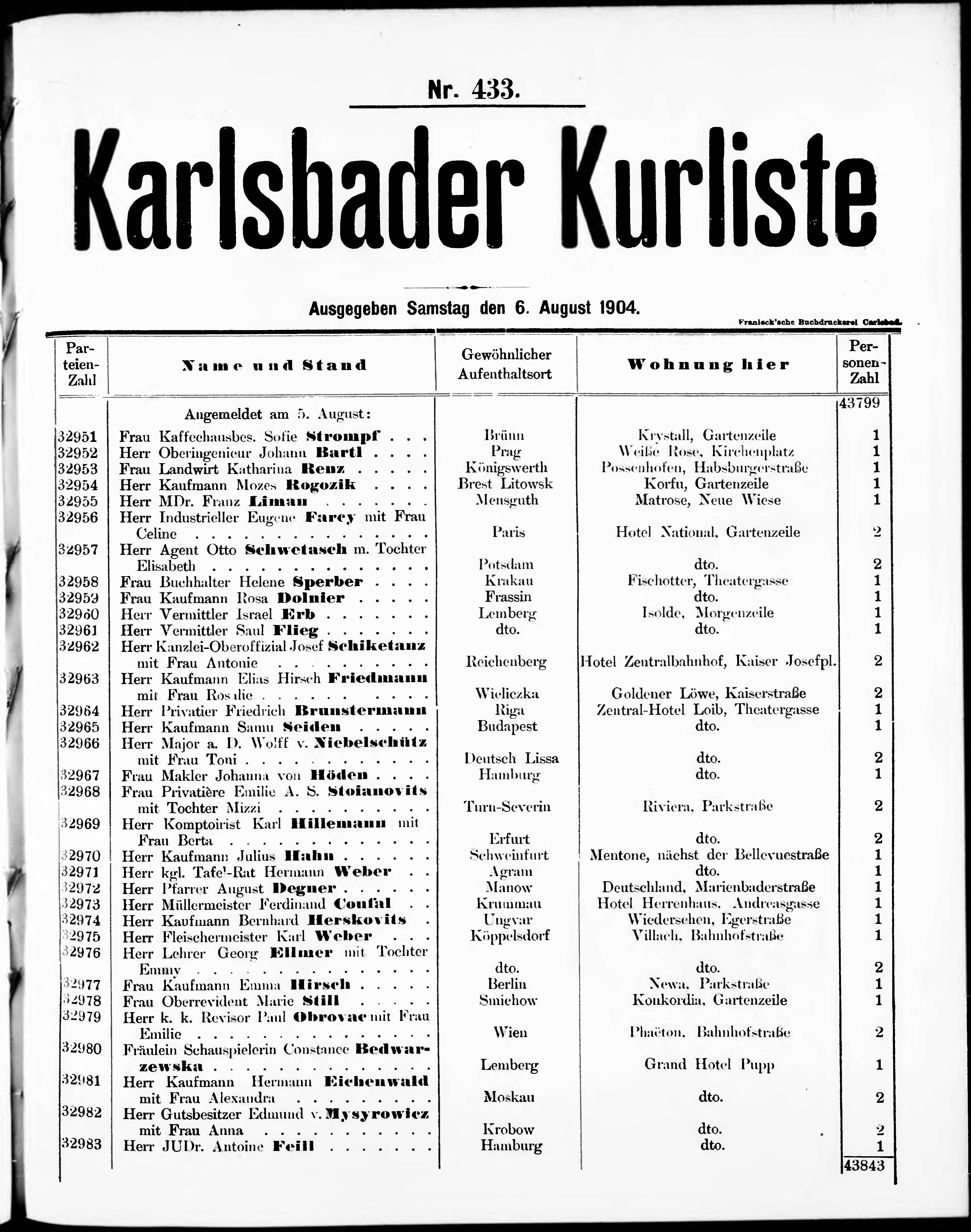 Liste der angekommenen und abgereisten P. T. Curgäste in Carlsbad im Jahre