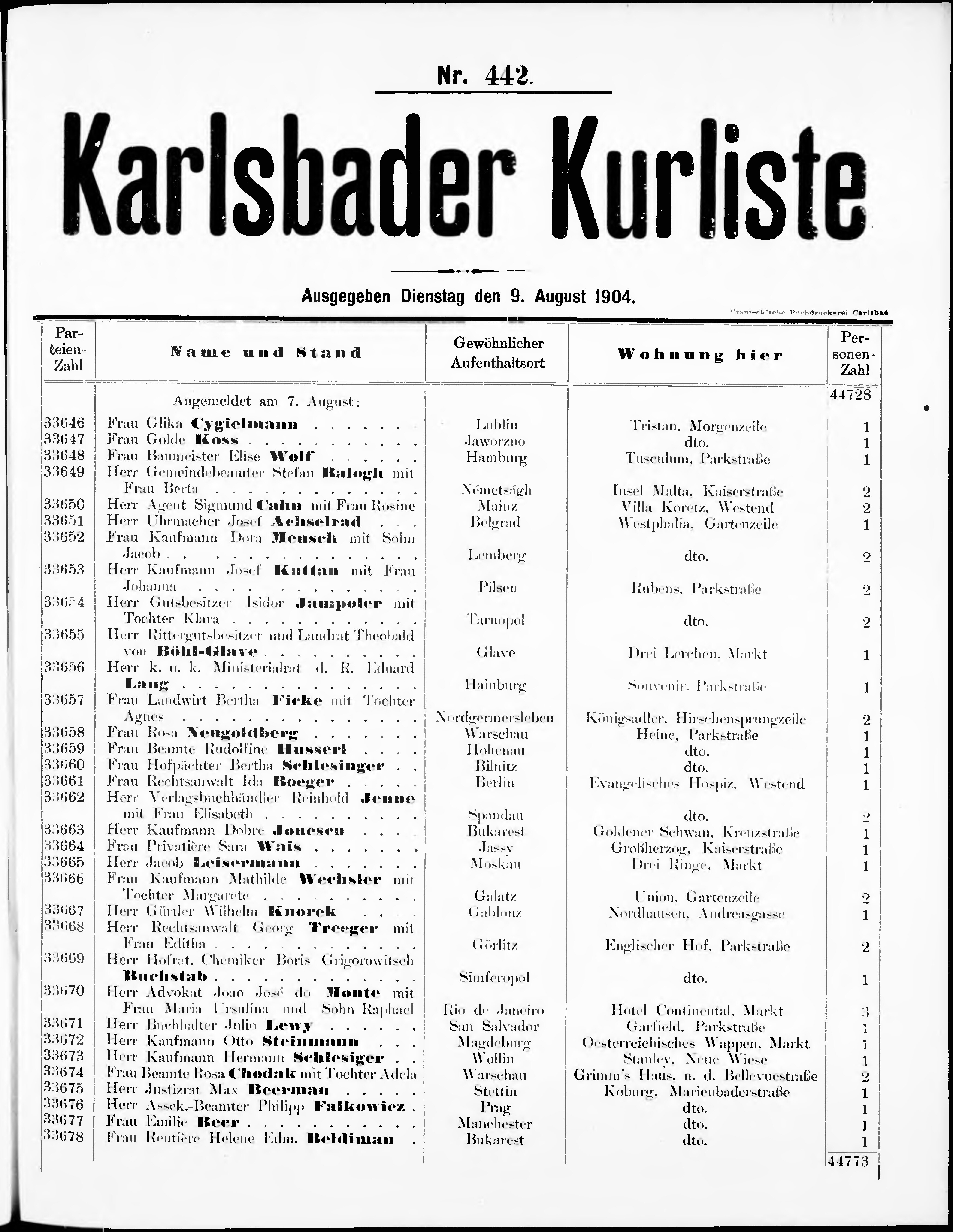 Liste der im Jahre ... angekommenen und abgereisten Kur- und Badegäste in Karlsb...