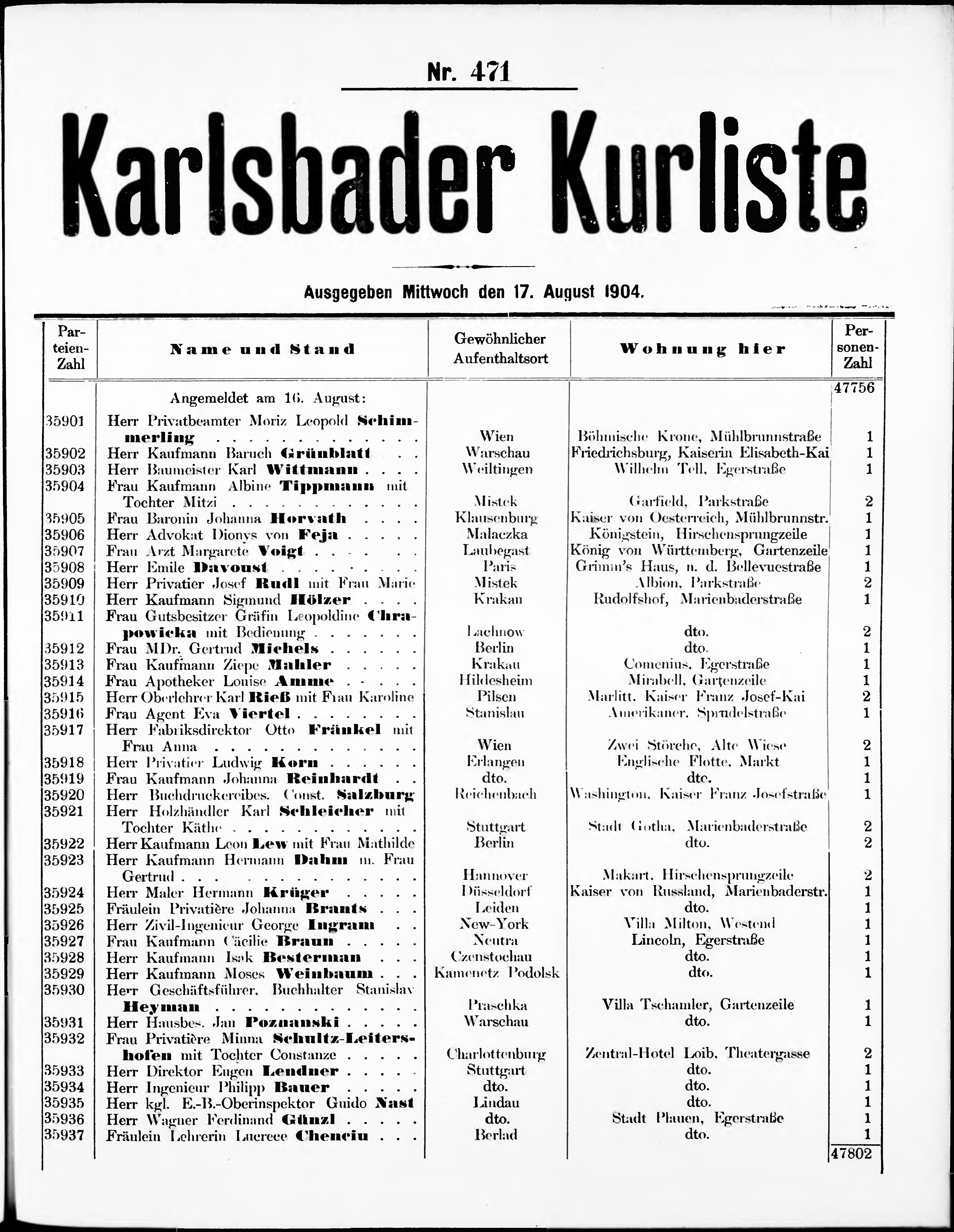 Liste der angekommenen und abgereisten P. T. Curgäste in Carlsbad im Jahre