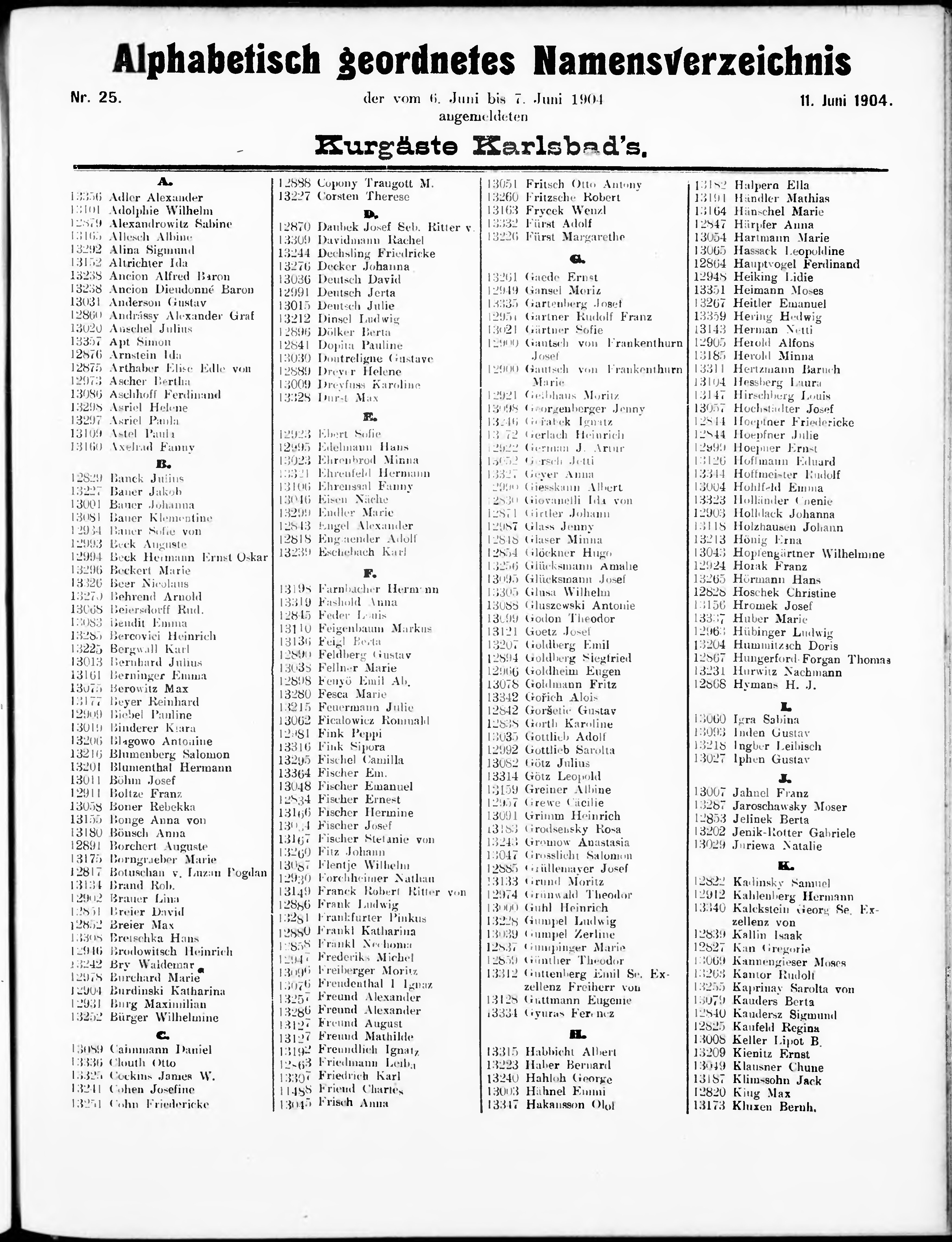 Liste der angekommenen und abgereisten P. T. Curgäste in Carlsbad im Jahre