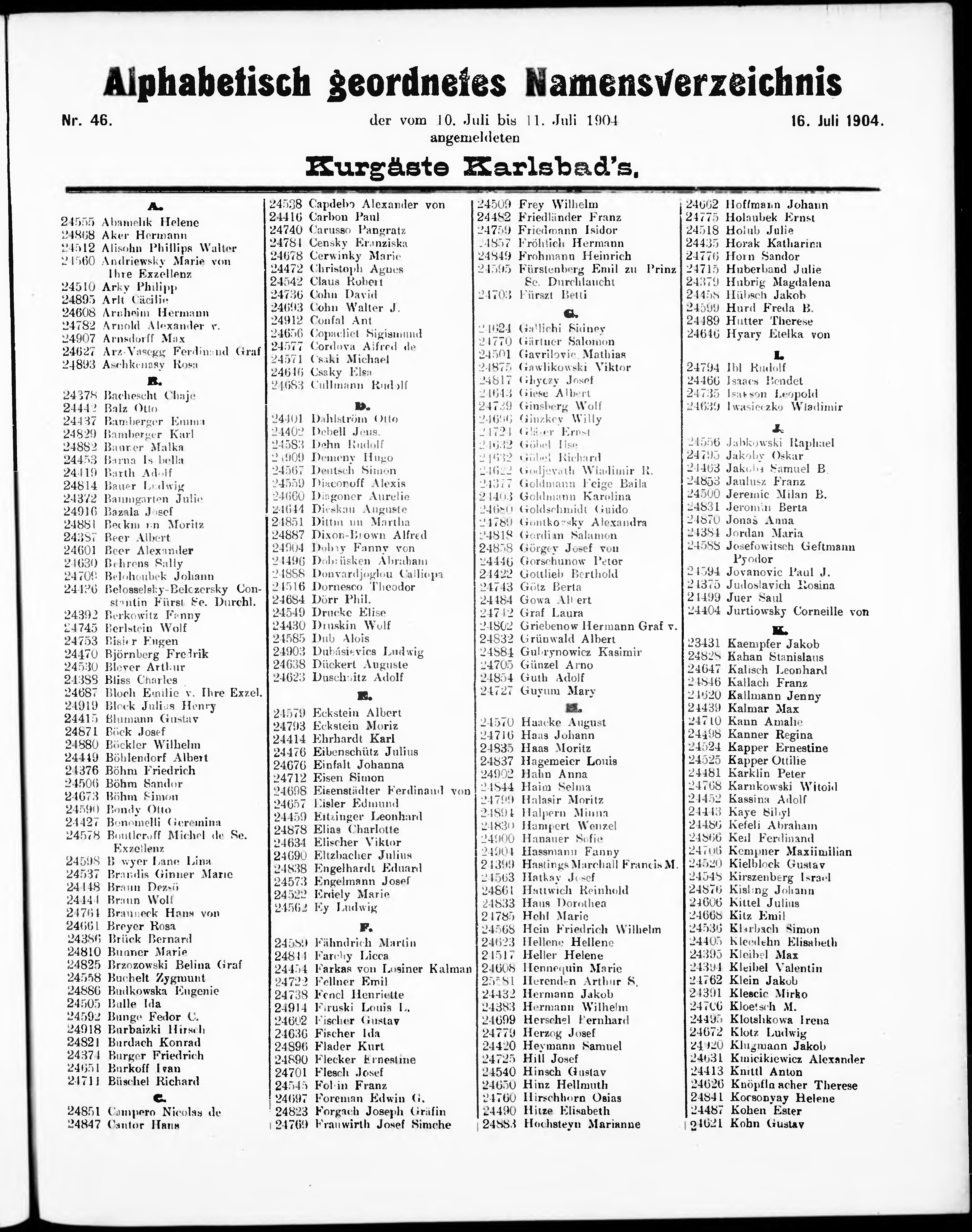Liste der angekommenen und abgereisten P. T. Curgäste in Carlsbad im Jahre