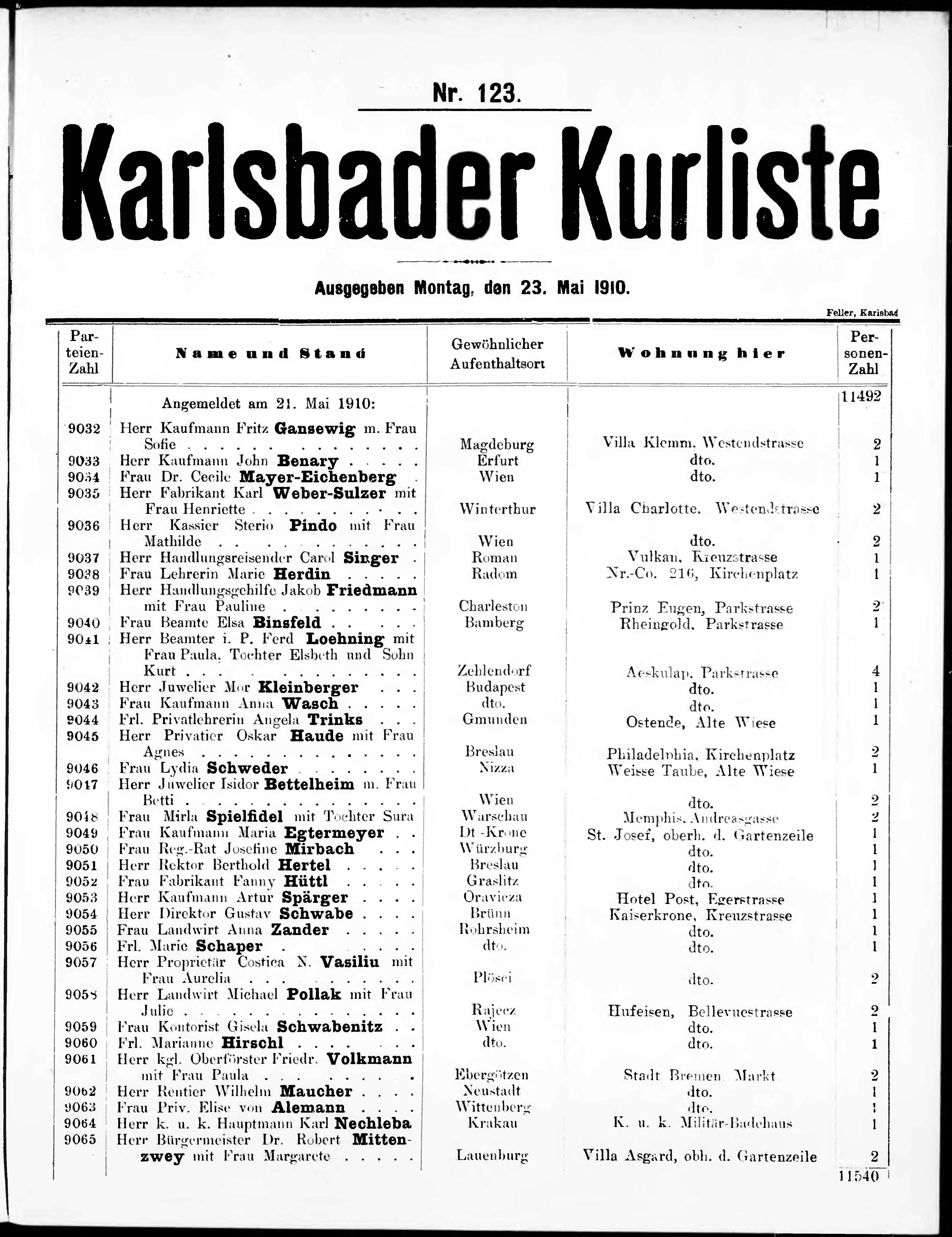 Liste der angekommenen und abgereisten P. T. Curgäste in Carlsbad im Jahre