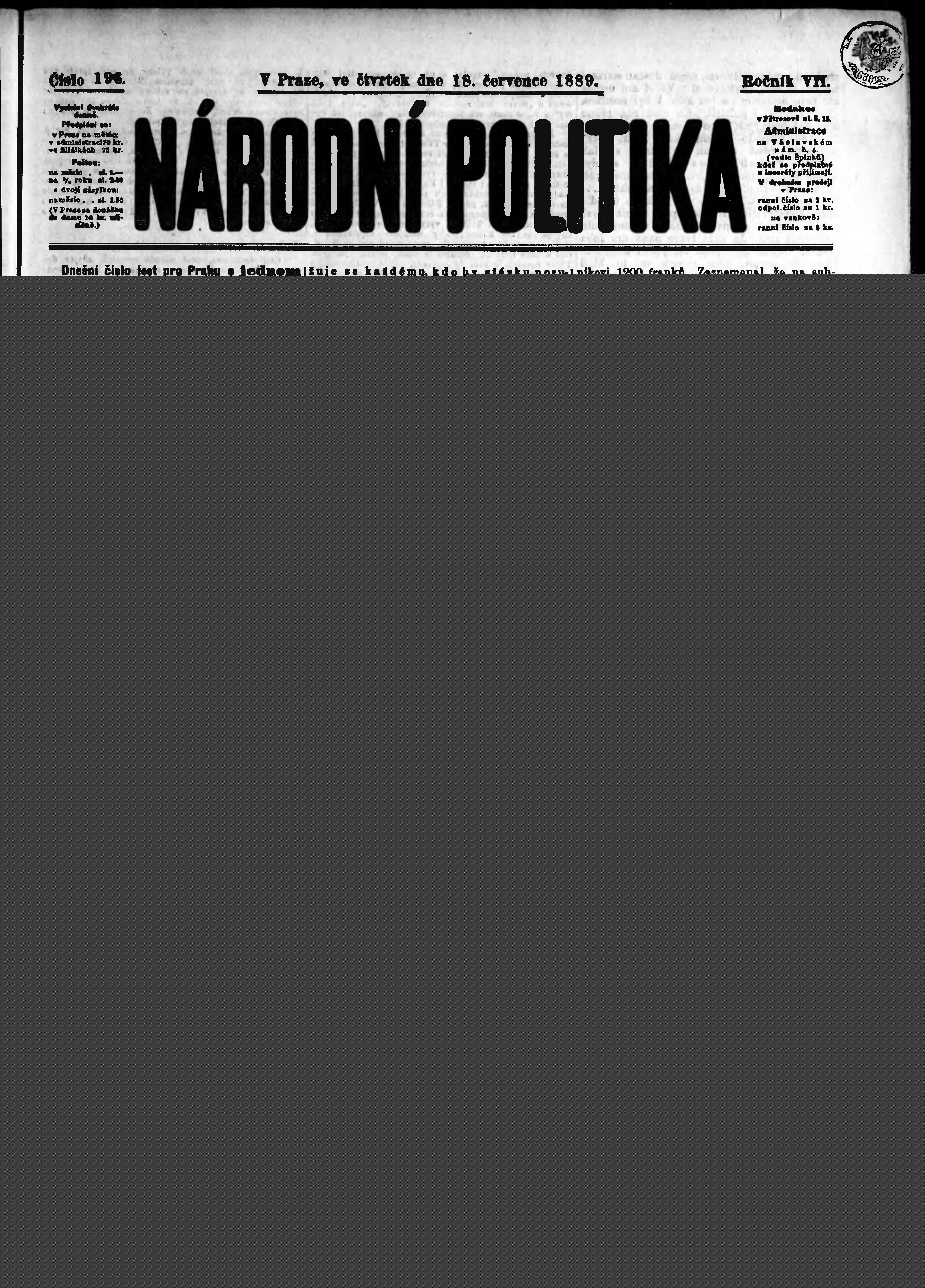 * Datum vydání výtisku: 18.7.1889 Číslo výtisku: 196