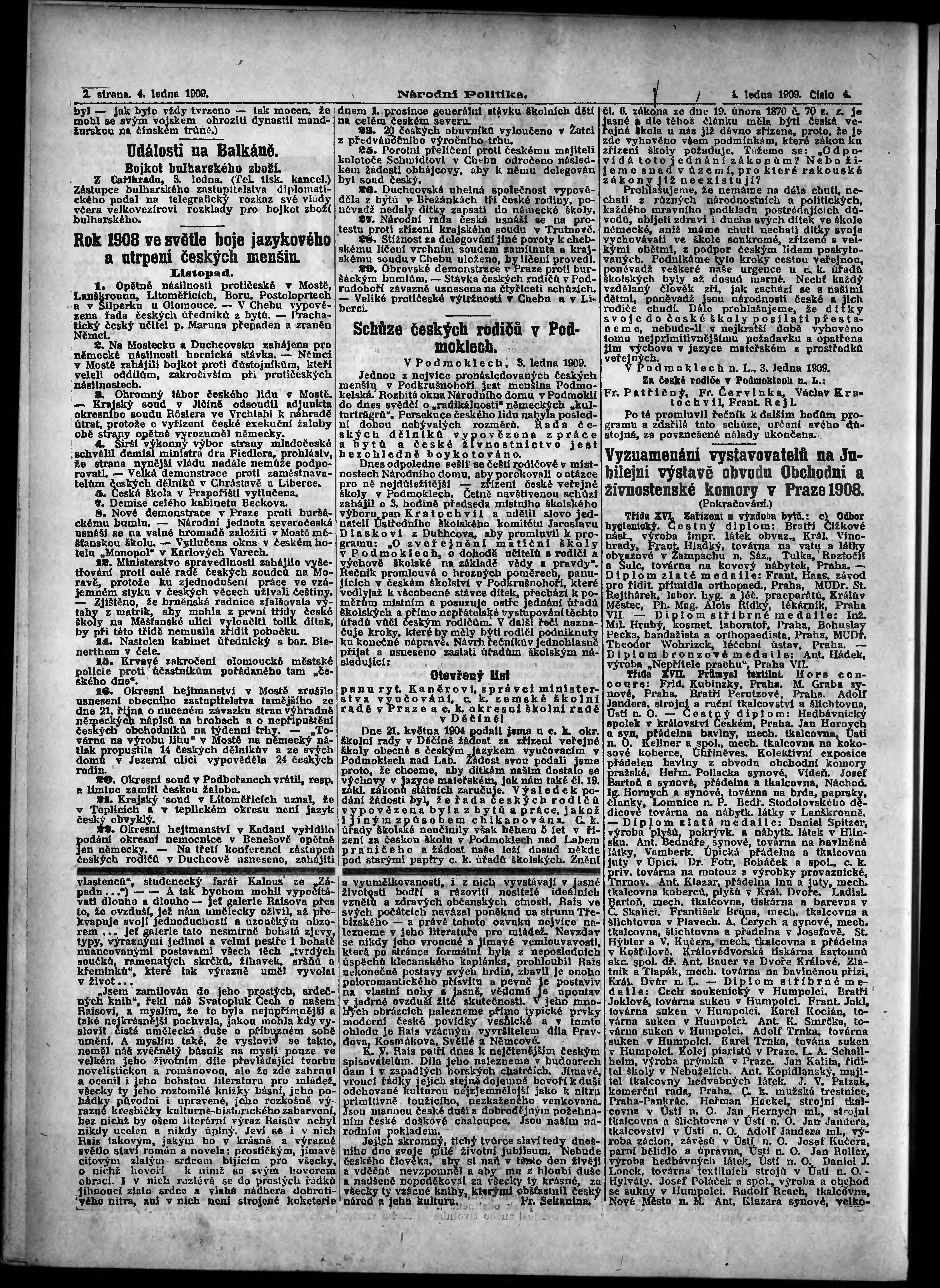 * Datum vydání výtisku: 4.1.1909 Číslo výtisku: 4