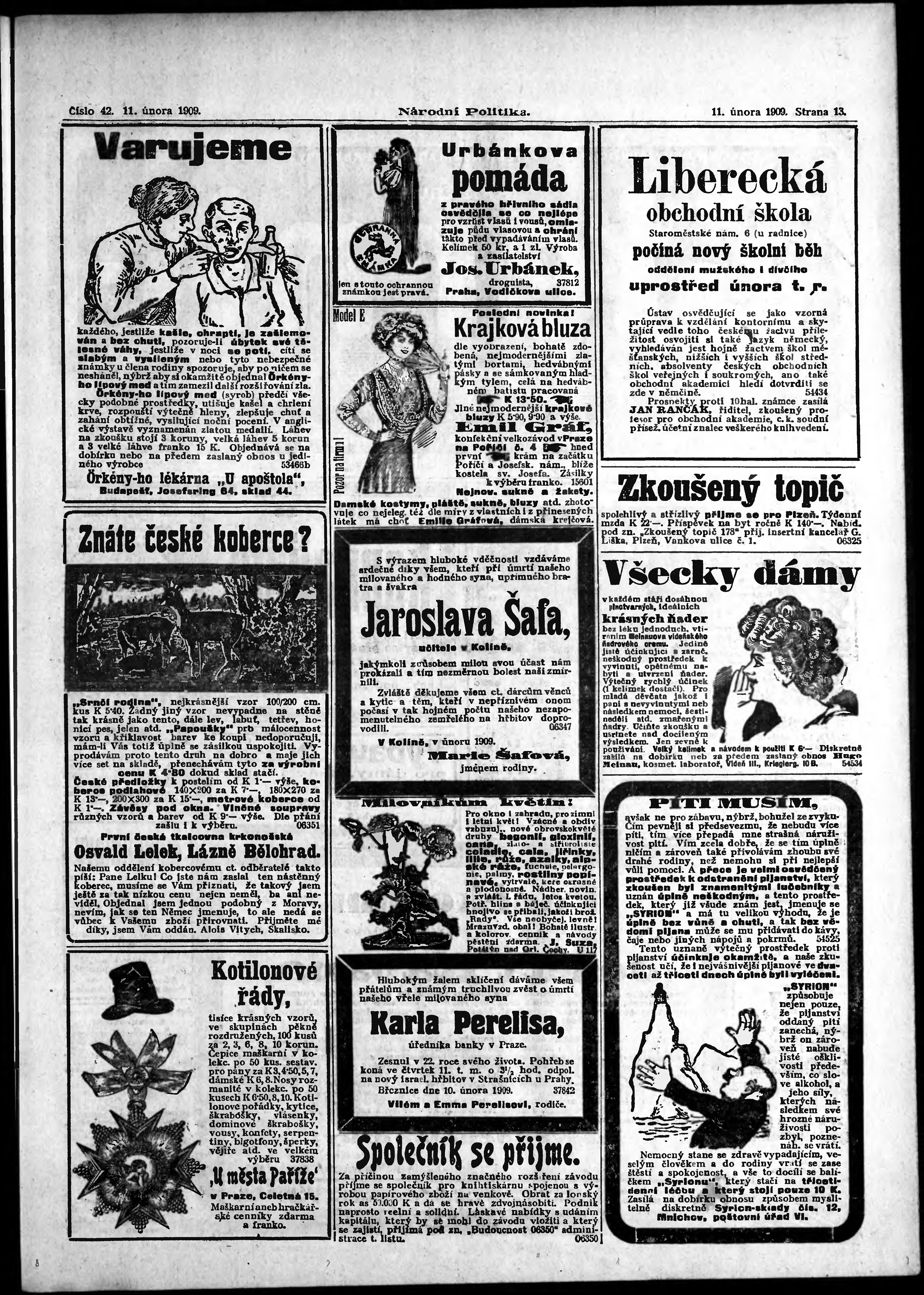 * Datum vydání výtisku: 11.2.1909 Číslo výtisku: 42
