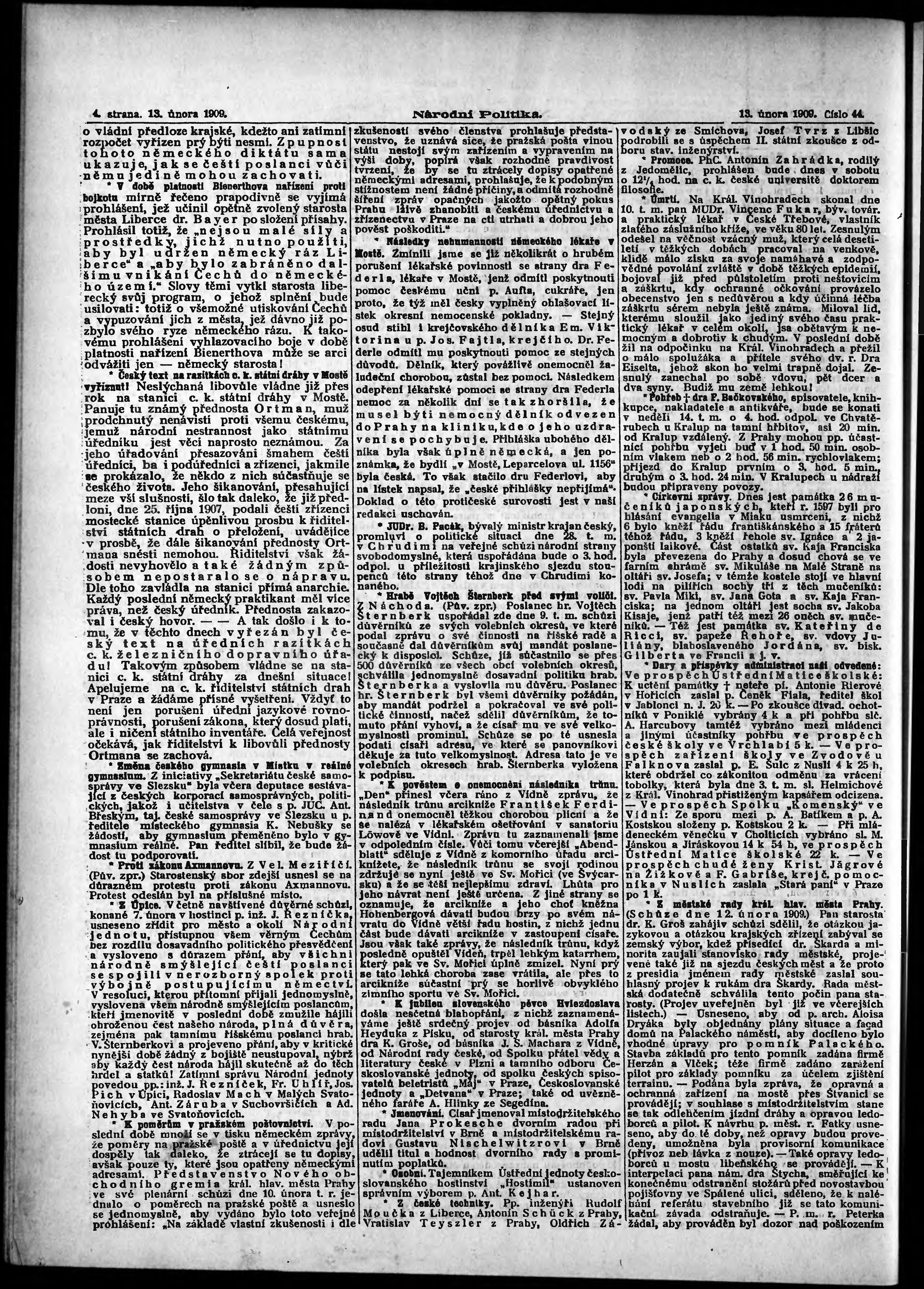 * Datum vydání výtisku: 13.2.1909 Číslo výtisku: 44