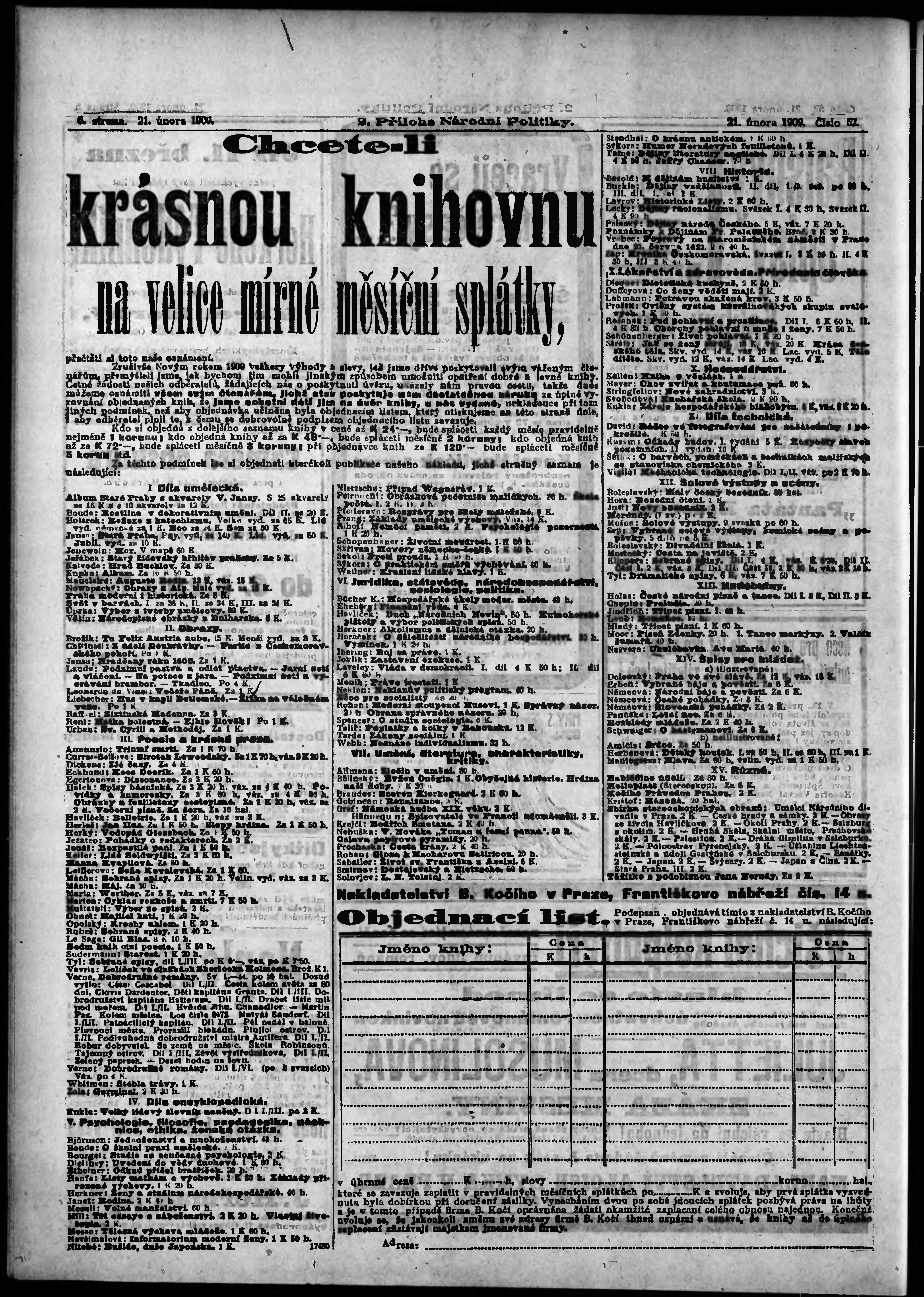 * Datum vydání výtisku: 21.2.1909 Číslo výtisku: 52 Typ výtisku: příloha Poznámky k výtisku: 2. příloha;
