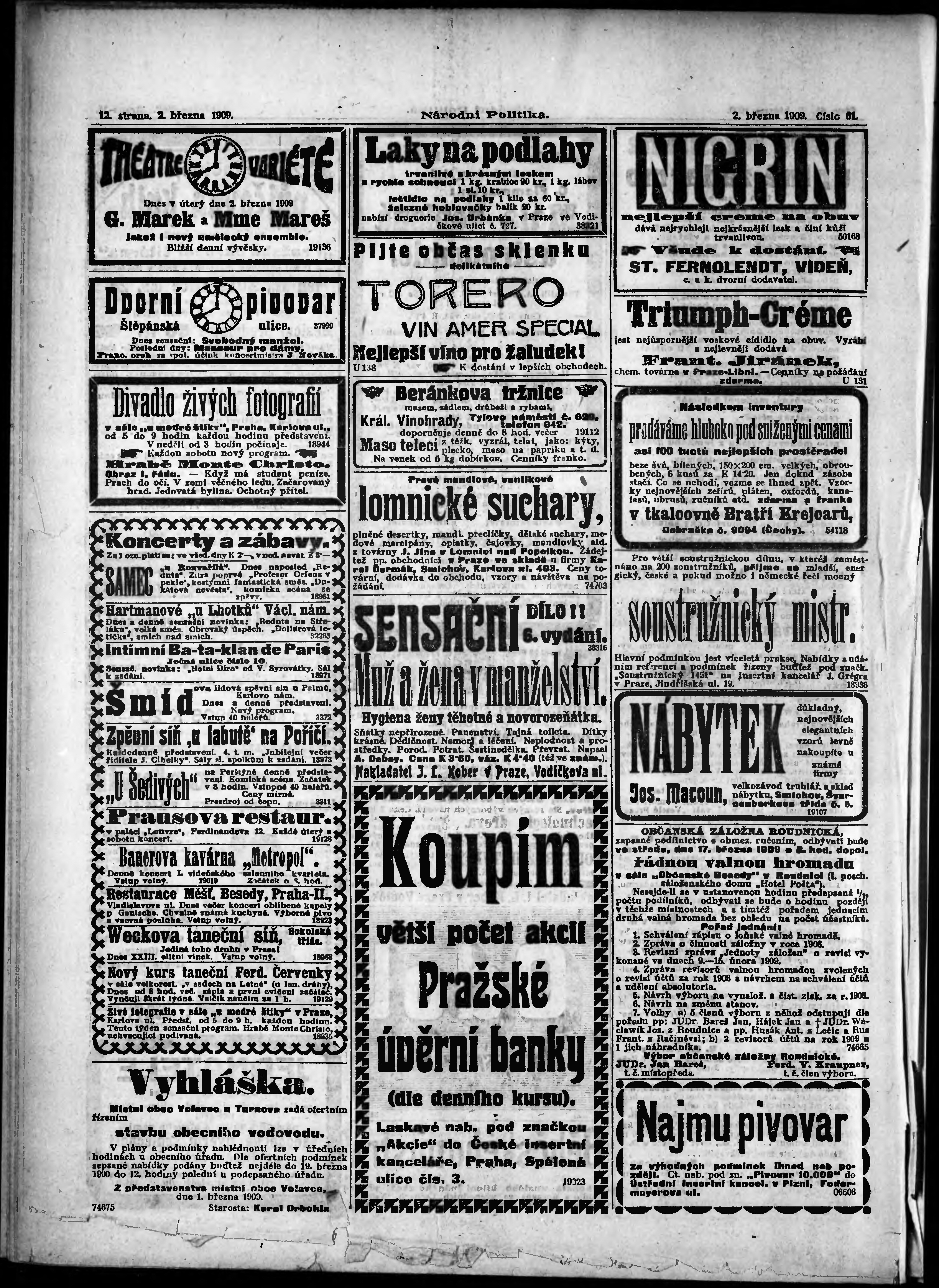 * Datum vydání výtisku: 2.3.1909 Číslo výtisku: 61 Poznámky k výtisku: s. 19 - 20 není k dispozici;