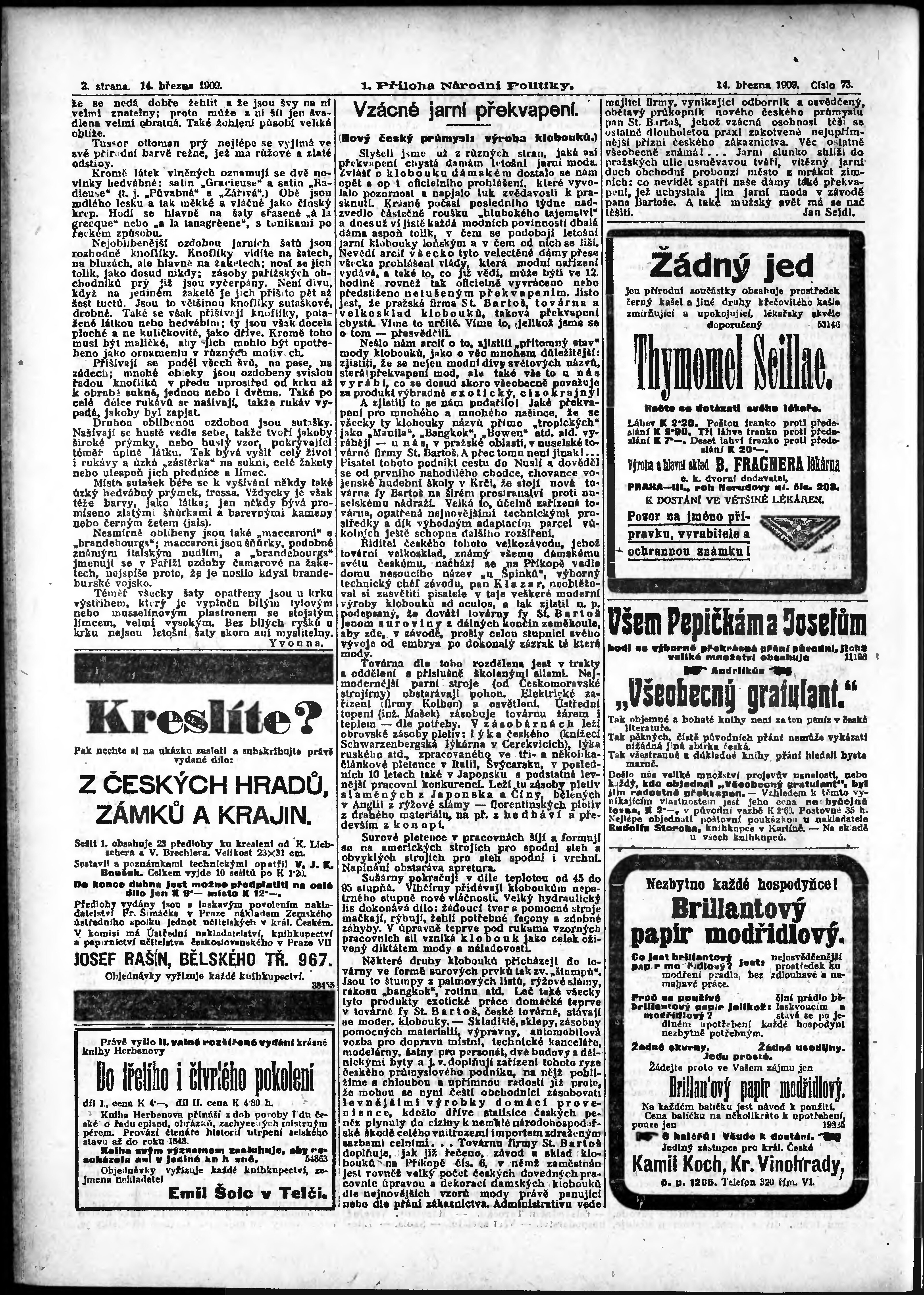 * Datum vydání výtisku: 14.3.1909 Číslo výtisku: 73 Typ výtisku: příloha Poznámky k výtisku: 1. příloha;