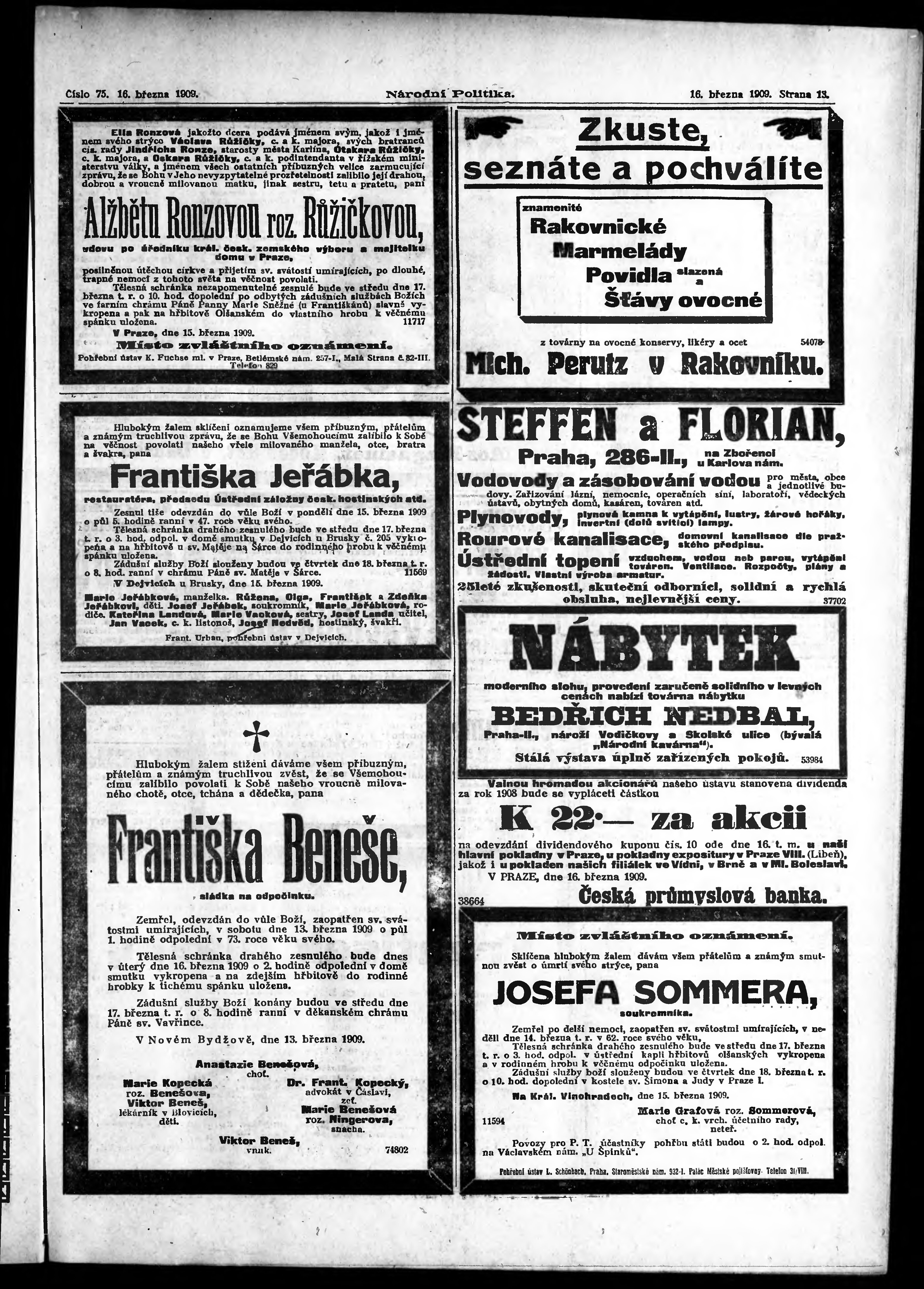 * Datum vydání výtisku: 16.3.1909 Číslo výtisku: 75