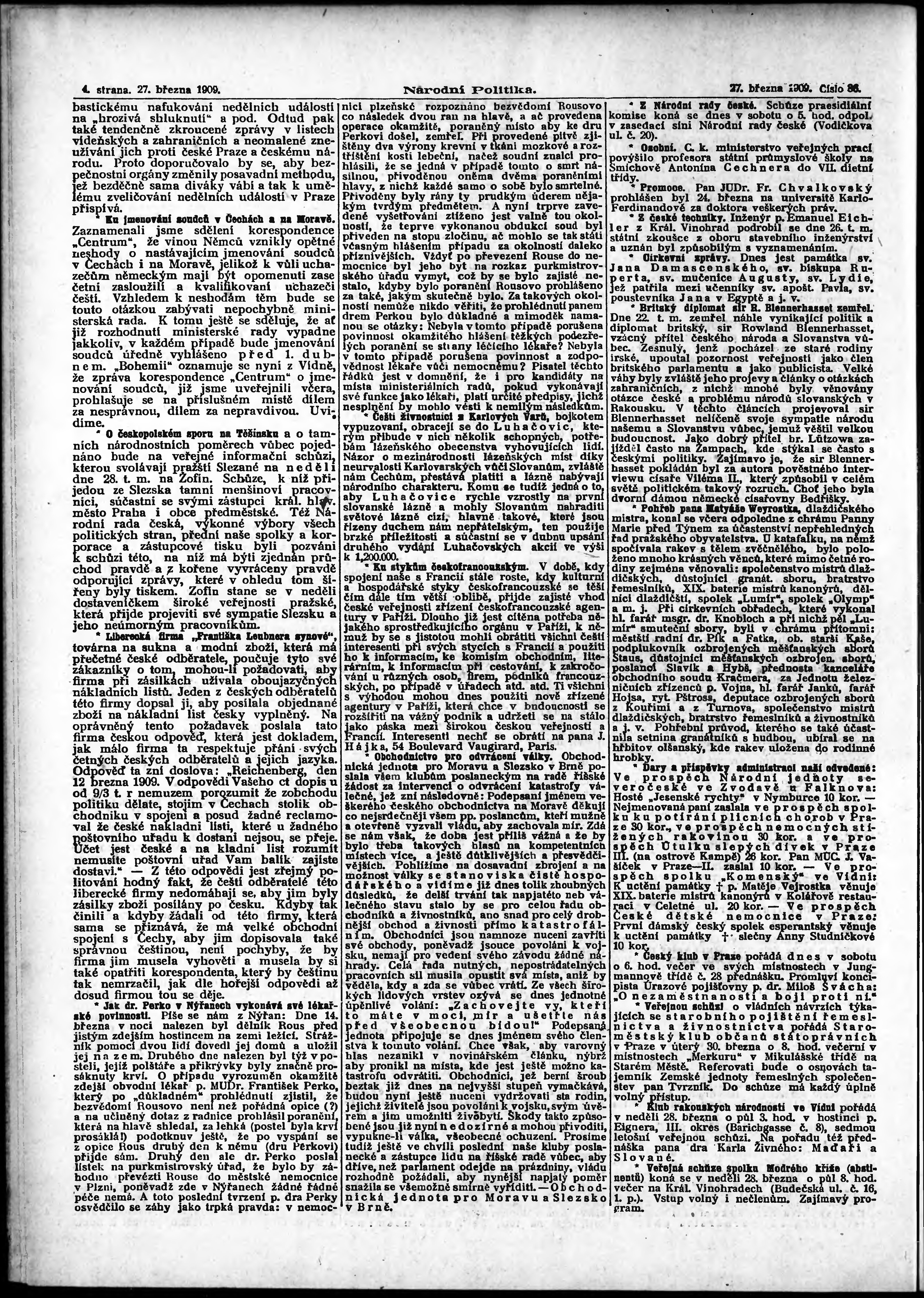 * Datum vydání výtisku: 27.3.1909 Číslo výtisku: 86