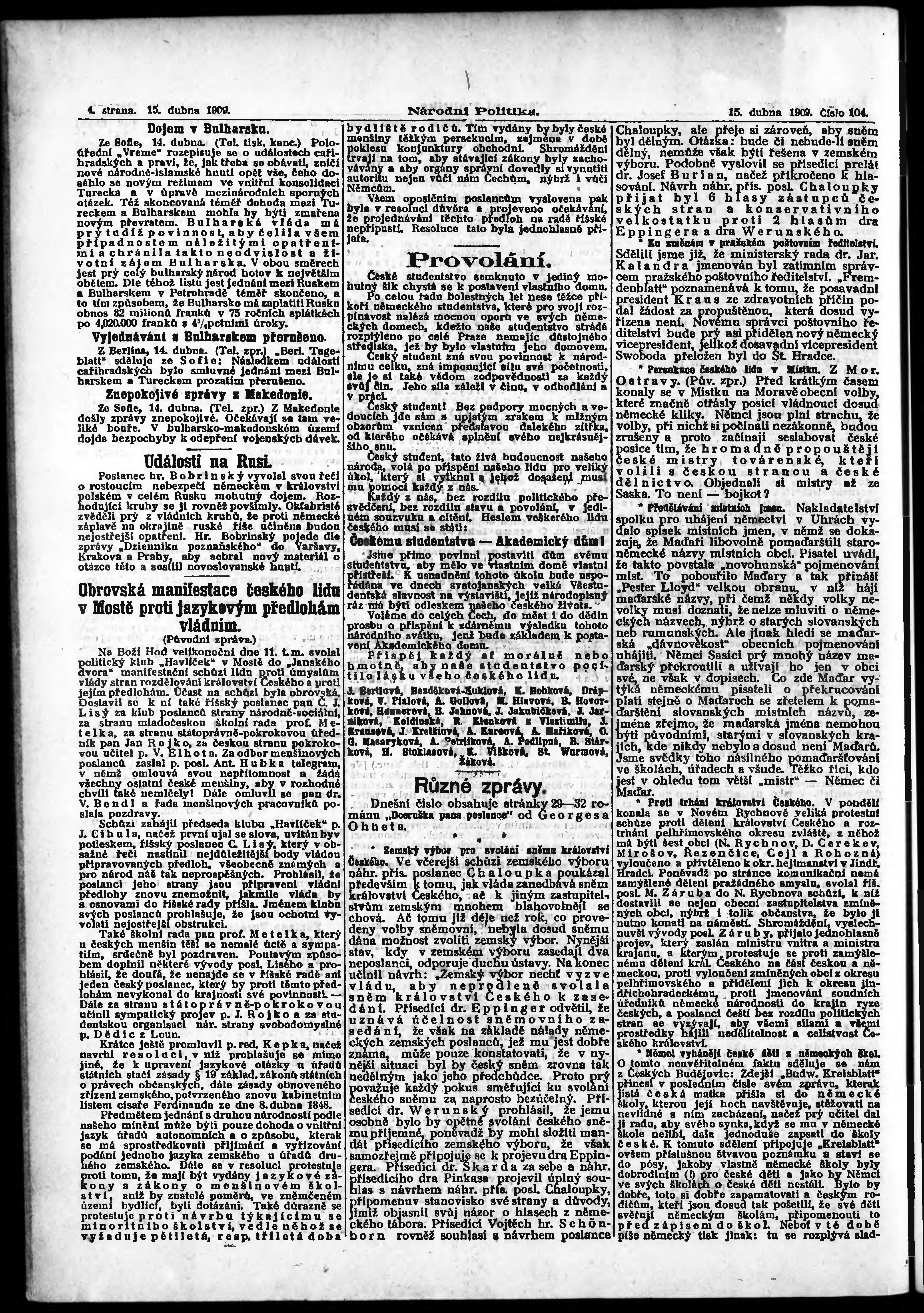 * Datum vydání výtisku: 15.4.1909 Číslo výtisku: 104