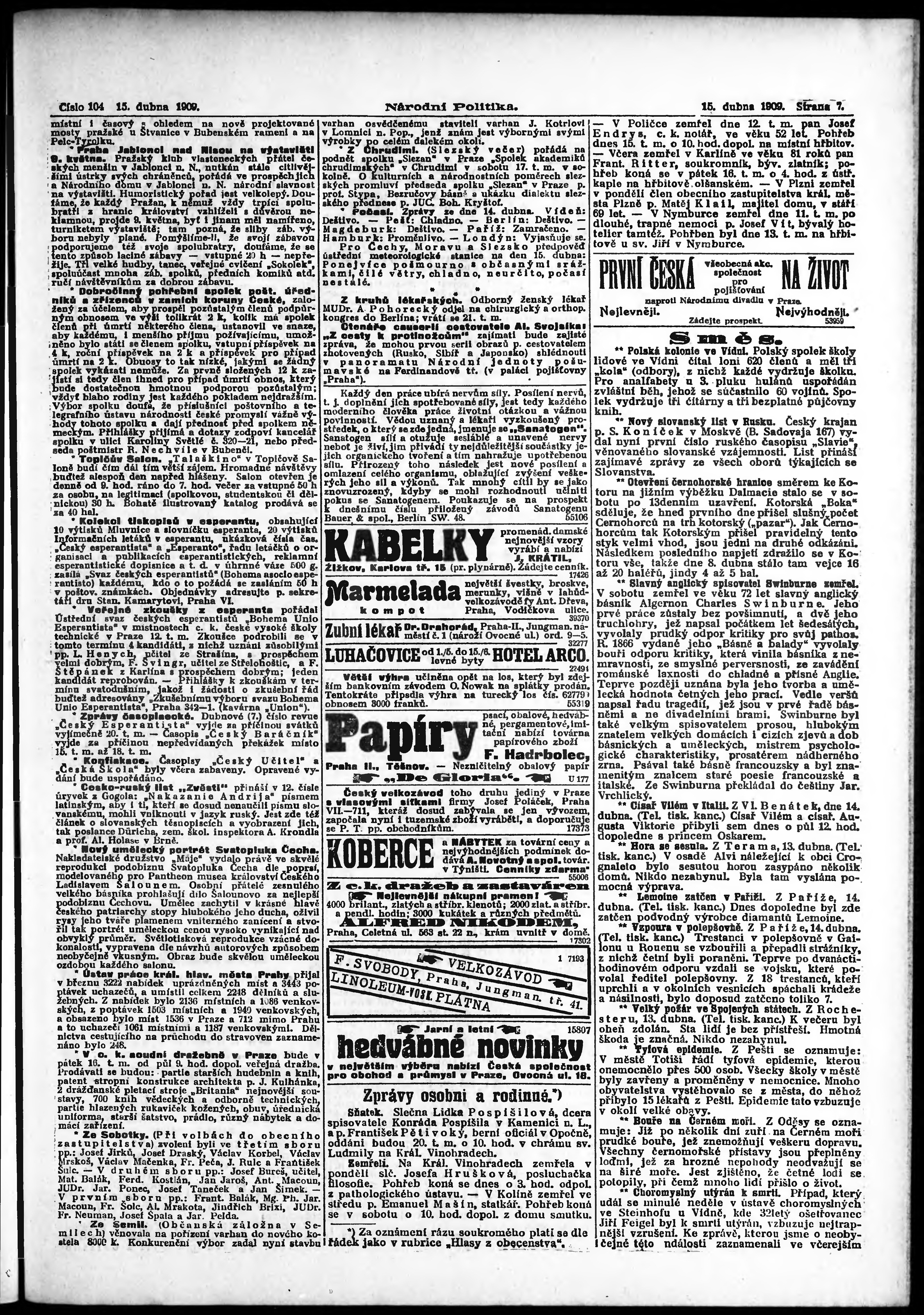 * Datum vydání výtisku: 15.4.1909 Číslo výtisku: 104