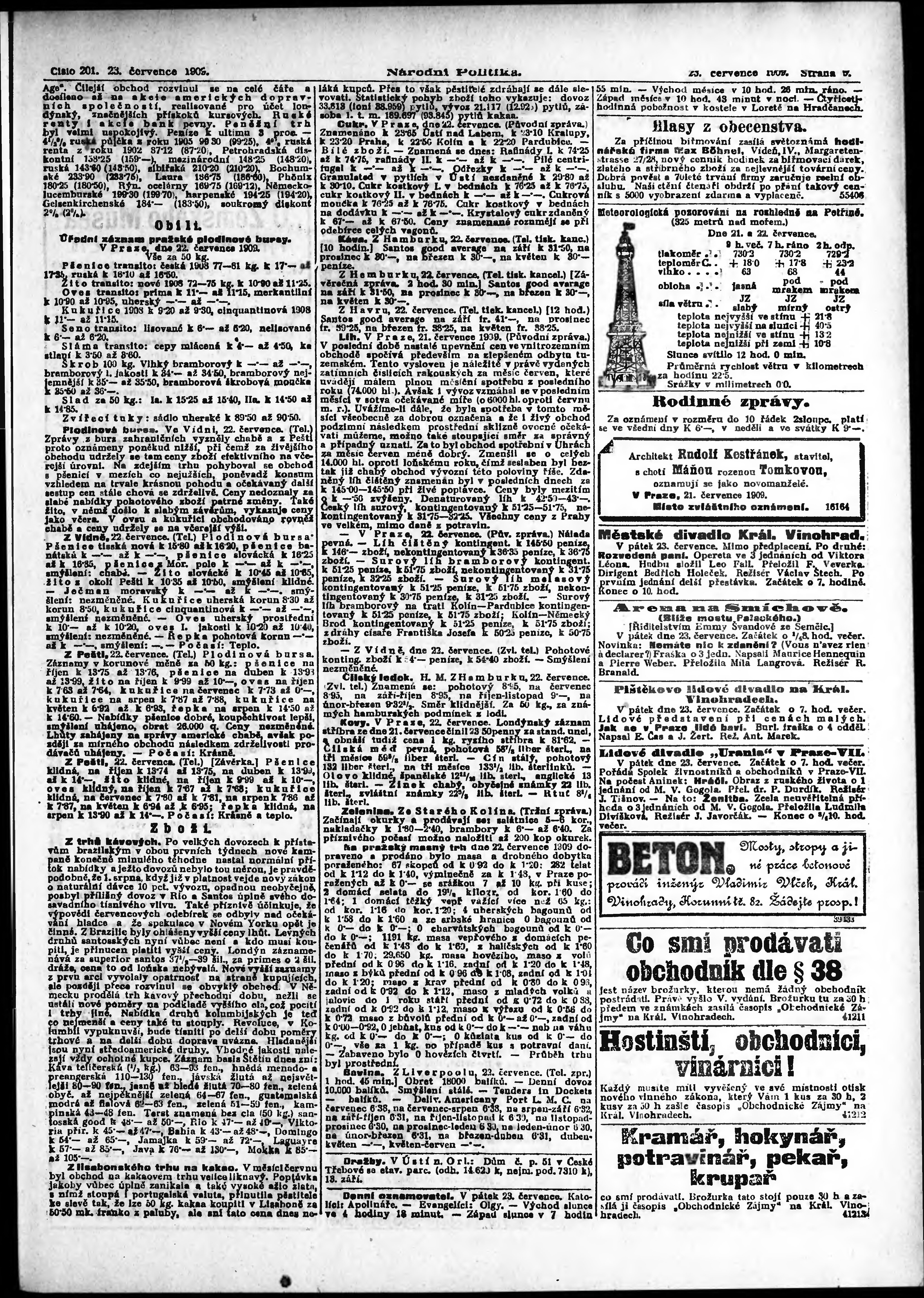 * Datum vydání výtisku: 23.7.1909 Číslo výtisku: 201