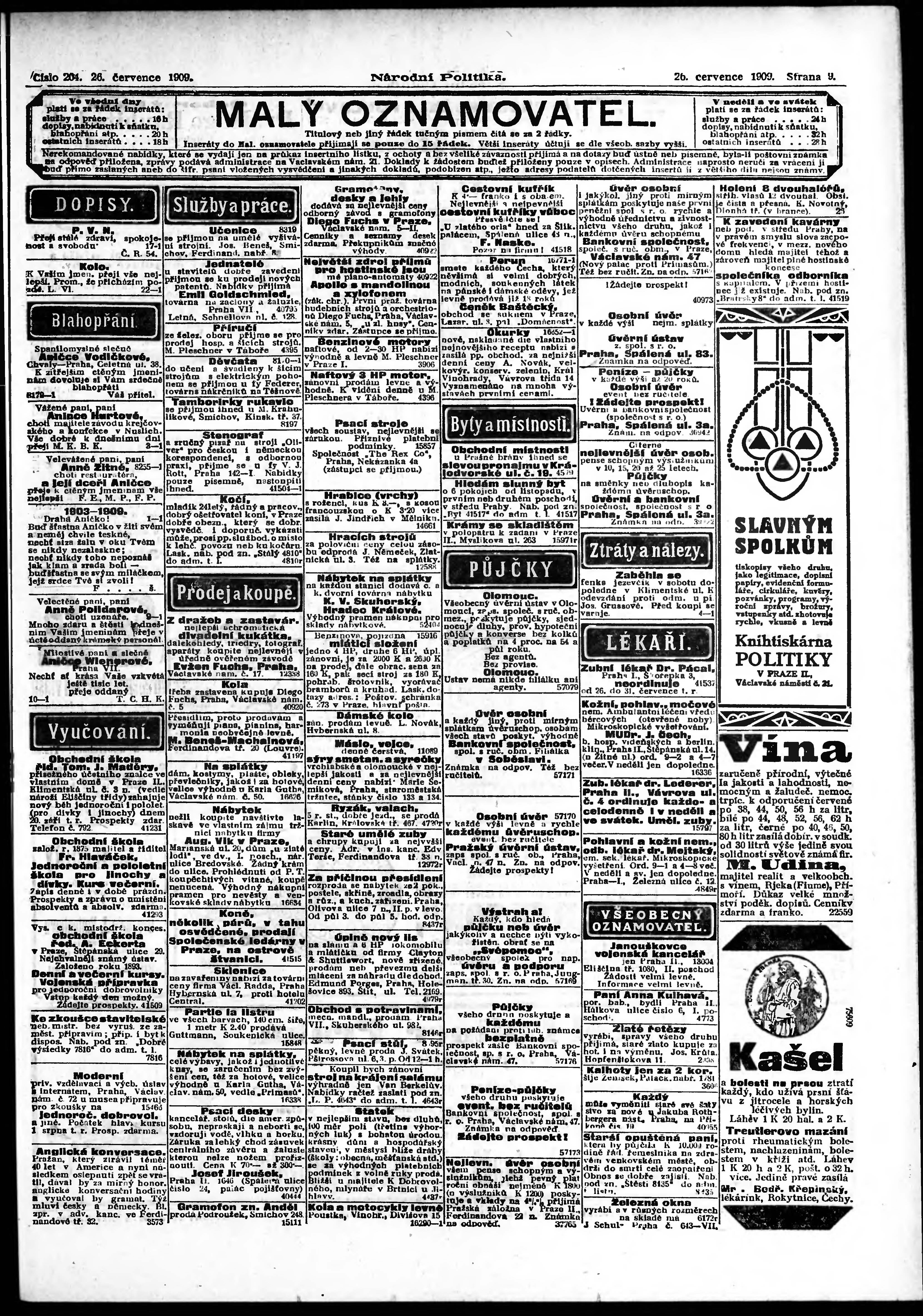 * Datum vydání výtisku: 26.7.1909 Číslo výtisku: 204