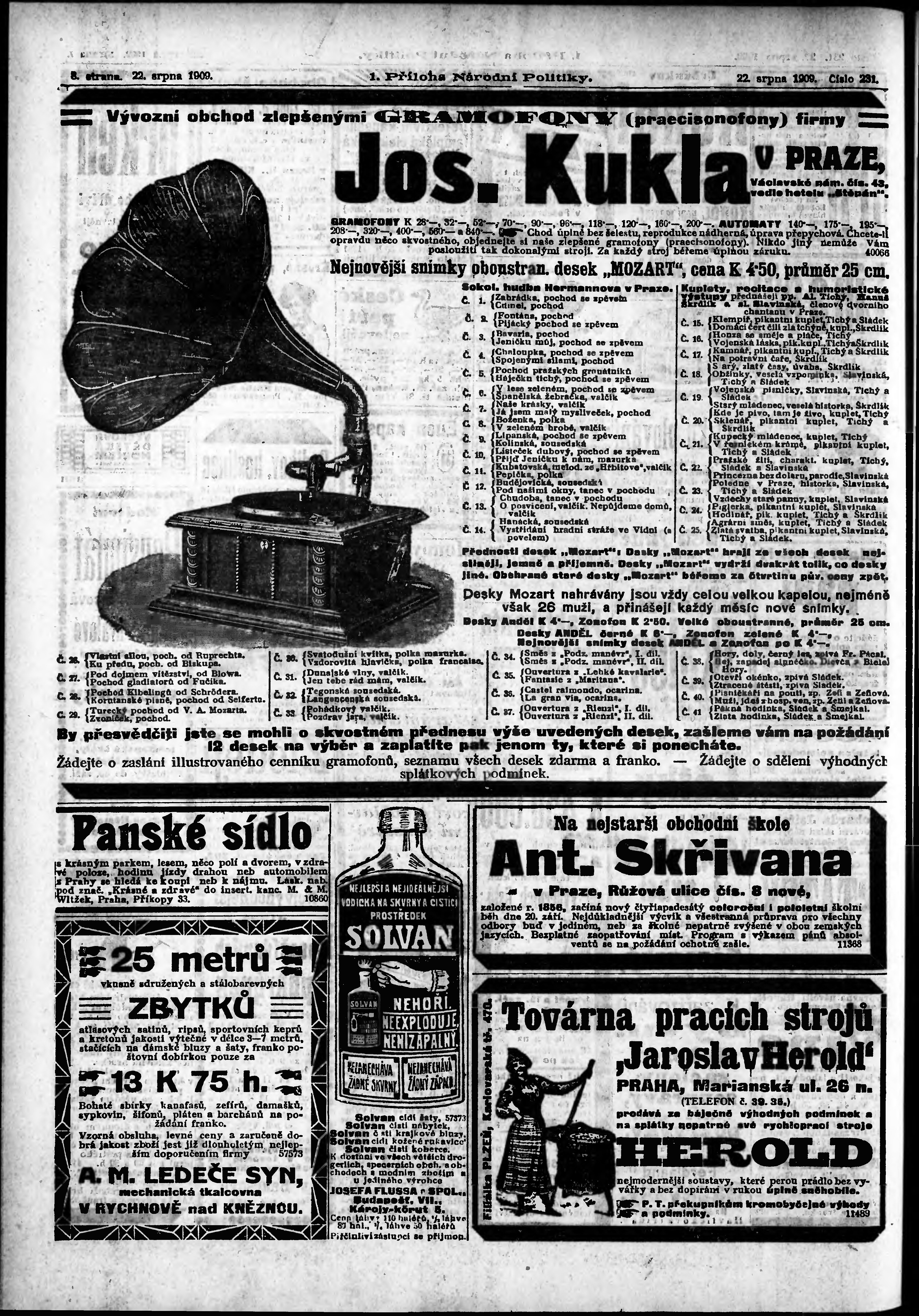 * Datum vydání výtisku: 22.8.1909 Číslo výtisku: 231 Typ výtisku: příloha Poznámky k výtisku: 1. příloha;