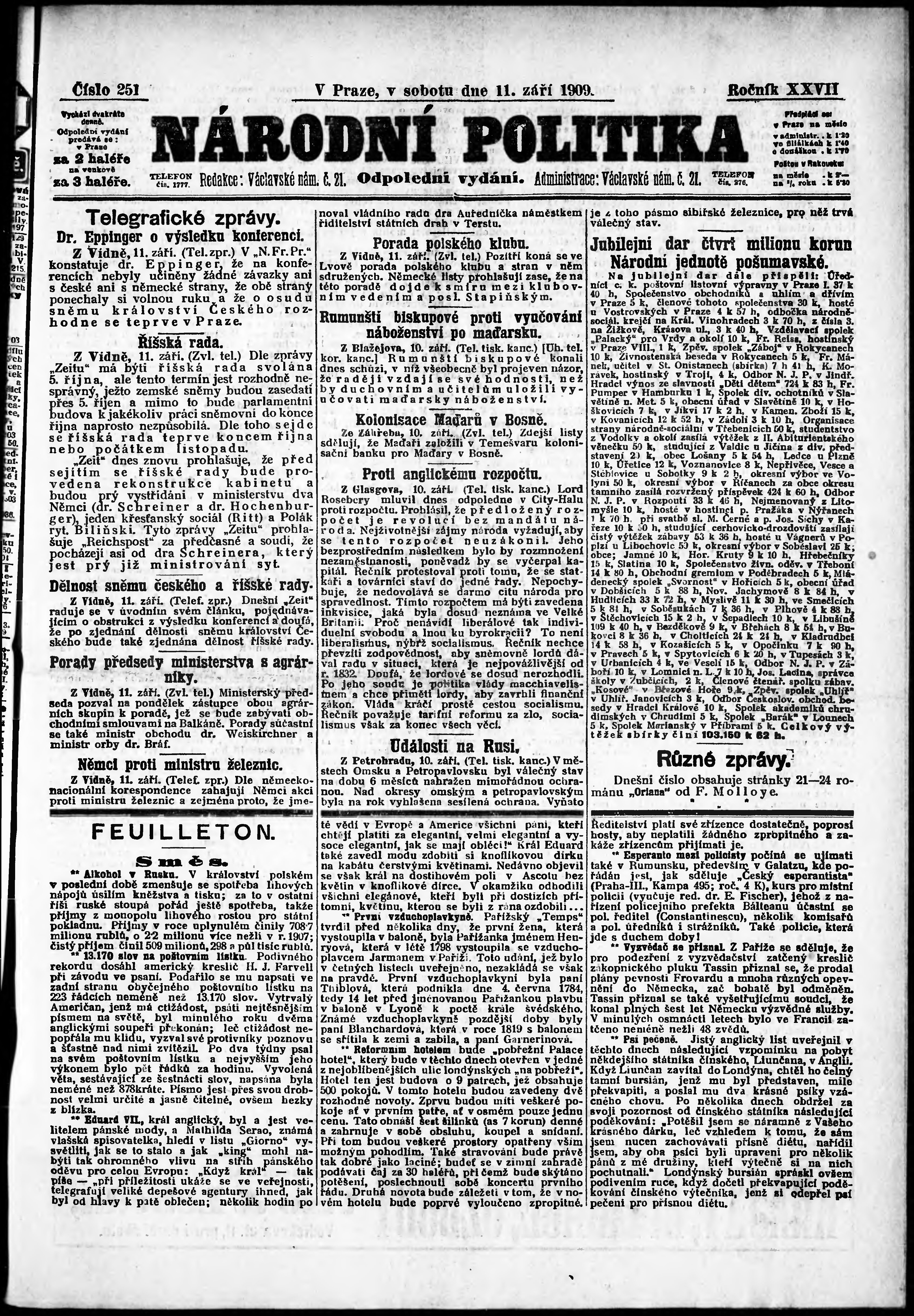 * Datum vydání výtisku: 11.9.1909 Číslo výtisku: 251 Poznámky k výtisku: odpolední vydání;