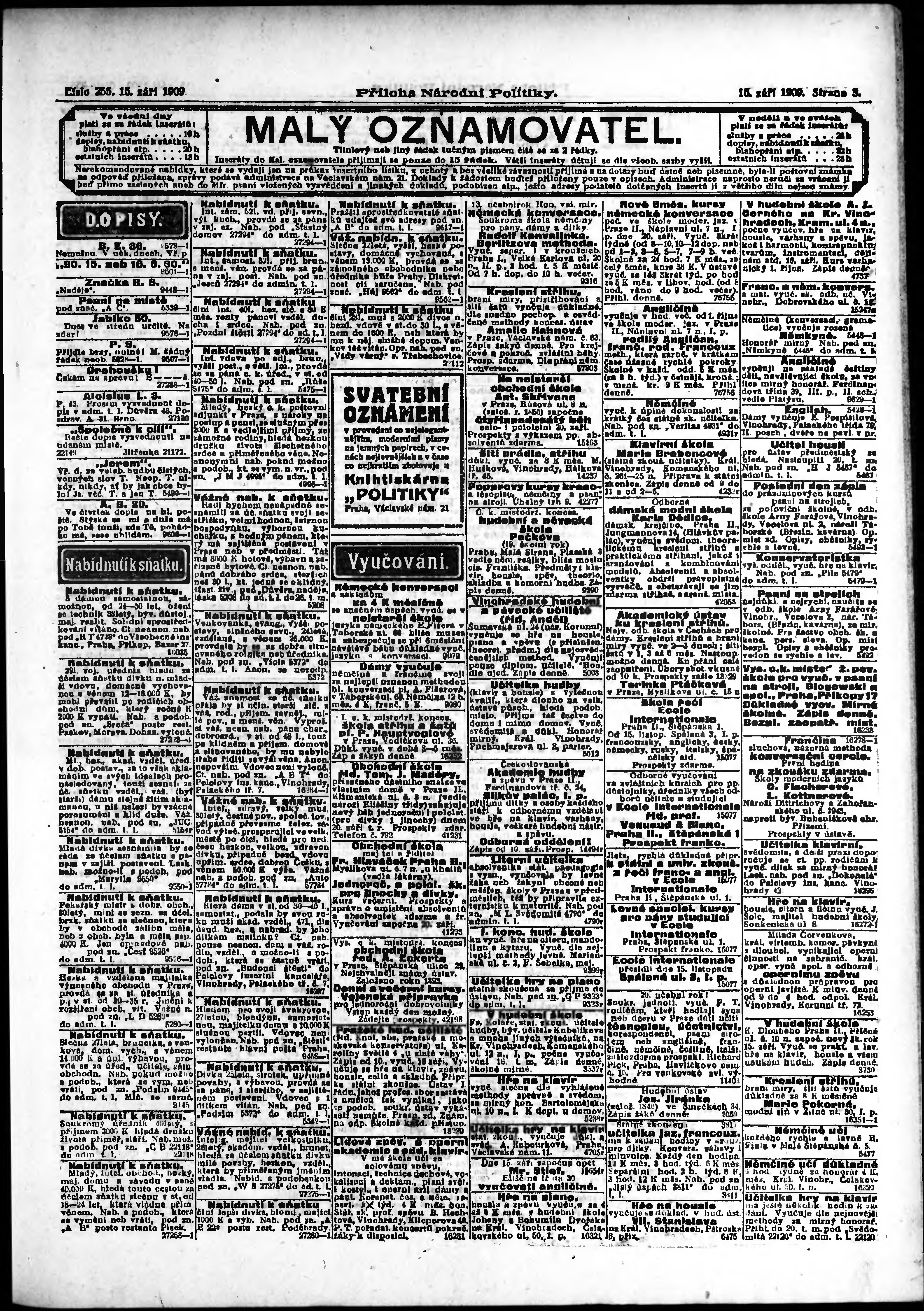 * Datum vydání výtisku: 15.9.1909 Číslo výtisku: 255 Typ výtisku: příloha